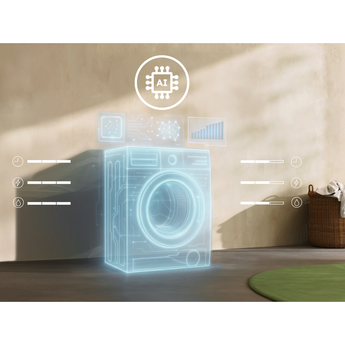 *In base all'algoritmo di rilevamento del carico allenato in precedenza su diversi carichi. Non vengono usati i dati degli utenti per allenare l'IA. **Basato su un test interno che confronta il consumo di tempo, acqua ed energia di un carico di 1 kg rispetto al carico massimo usando il ciclo Cotone 30°C con AI WashAssist che regola il programma in base al carico.