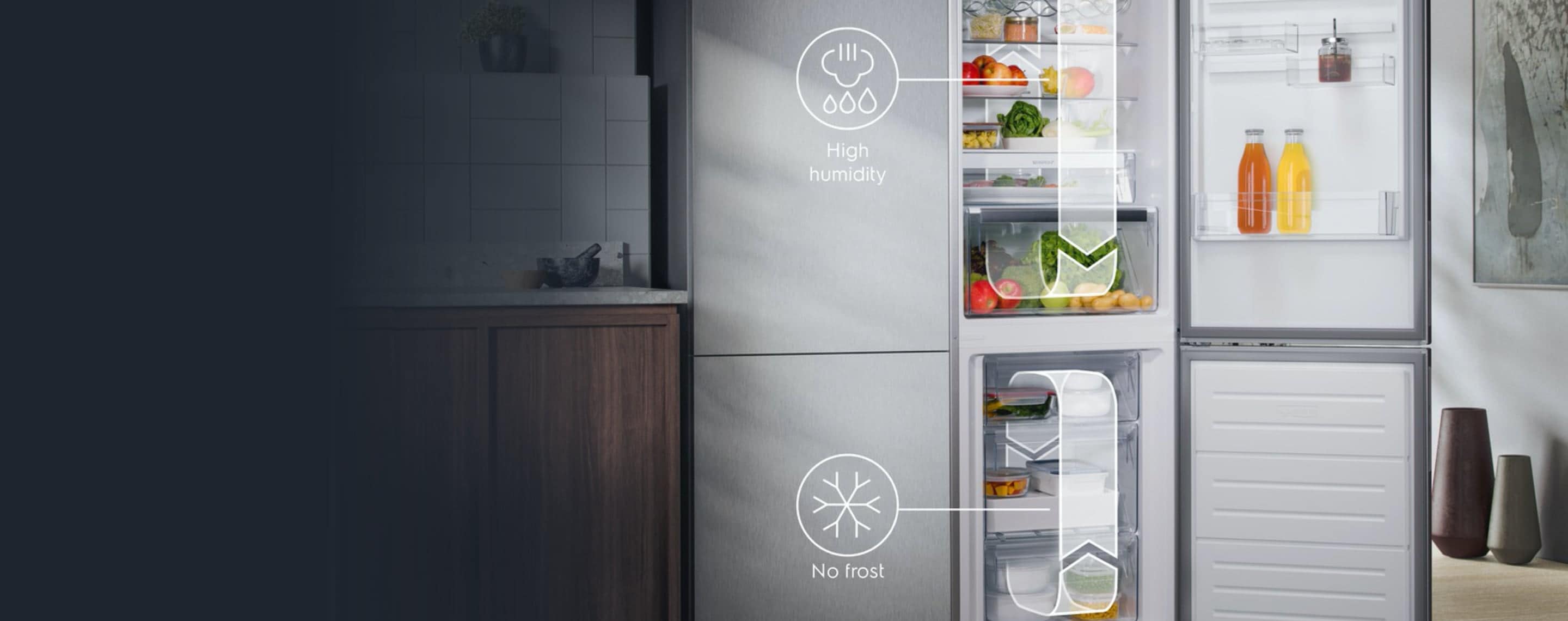 La tecnologia avanzata di raffreddamento doppio e la circolazione indipendente dell’aria assicurano che l’aria secca del congelatore non venga utilizzata per raffreddare il frigorifero, come avviene invece nei modelli Total No Frost standard. Inoltre, un congelatore completamente No Frost significa che non dovrai mai più sbrinarlo.