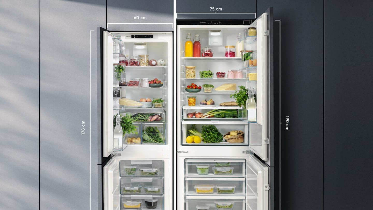 I frigocongelatori a incasso sono disponibili in dimensioni standard, alloggiati dietro l’anta di un mobile in cucina; i modelli indipendenti hanno altezza e larghezza diverse. Le dimensioni della nicchia sono di 60-190 cm. Ad esempio, il frigocongelatore MaxiSpace offre il 45% di capacità in più dei modelli standard a incasso. Tutte le dimensioni sono disponibili sulle pagine dei prodotti.