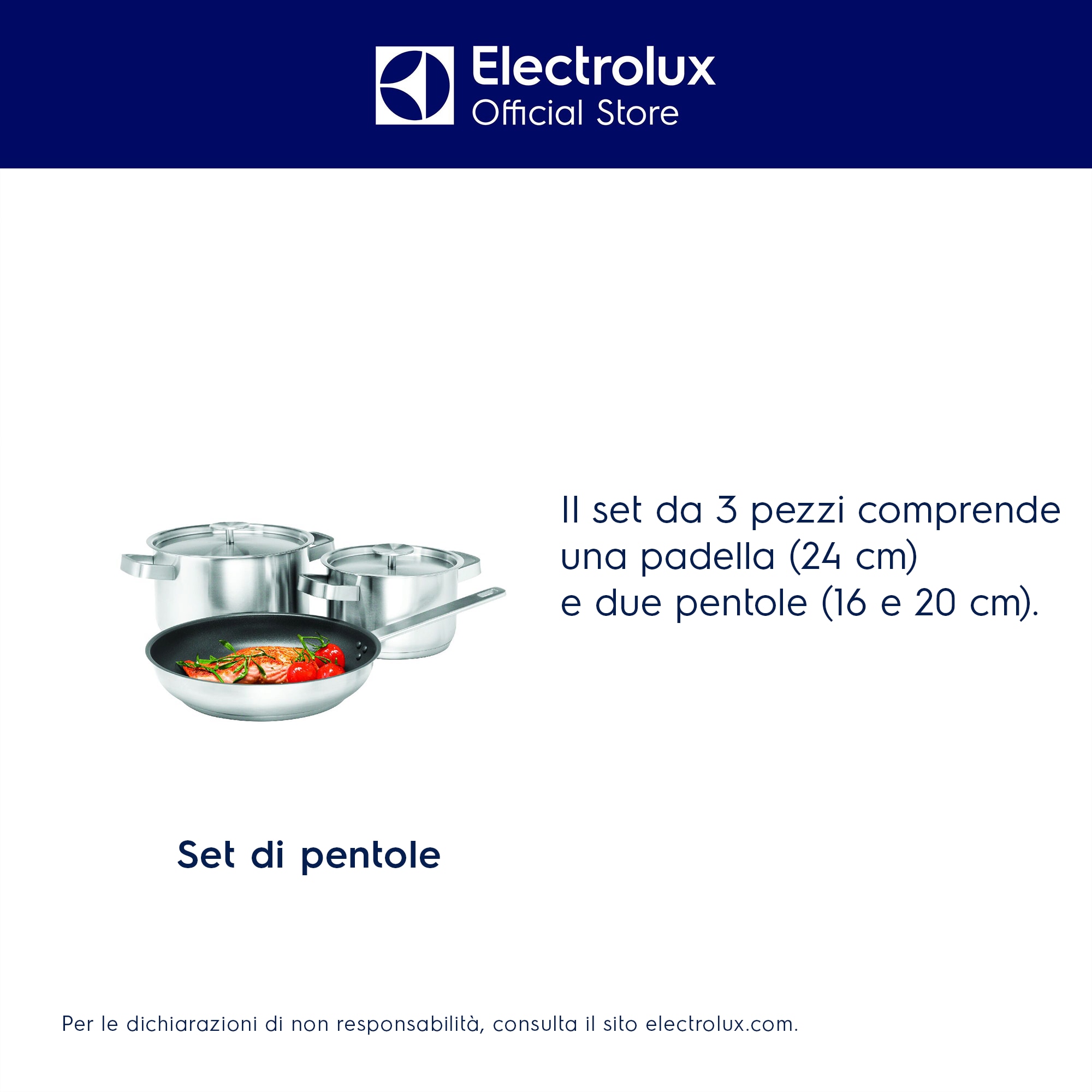 Preparati a liberare la tua creatività in cucina con il set di pentole da tre pezzi di Electrolux. Il set è composto da una padella (24 cm) e due tegami (16 cm, 20 cm). Studiate per l'utilizzo con i piani ad induzione, ma adatte a tutti i piani cottura, sono tutto ciò che ti serve per creare piatti deliziosi ogni giorno.