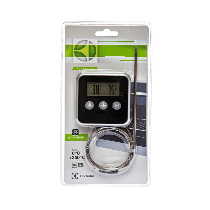 Gustatevi una succulenta braciola o una fetta di tonno, cotte alla perfezione con la sola pressione di un pulsante. Questo termometro digitale con termosonda per carne, timer e allarme acustico vi informerà sul livello di cottura a seconda delle vostre preferenze. L'alloggiamento in silicone e la sonda in acciaio inox sono facili da pulire e il timer dispone di un conto alla rovescia fino a 99 minuti. Temperatura max.: 250˚C.