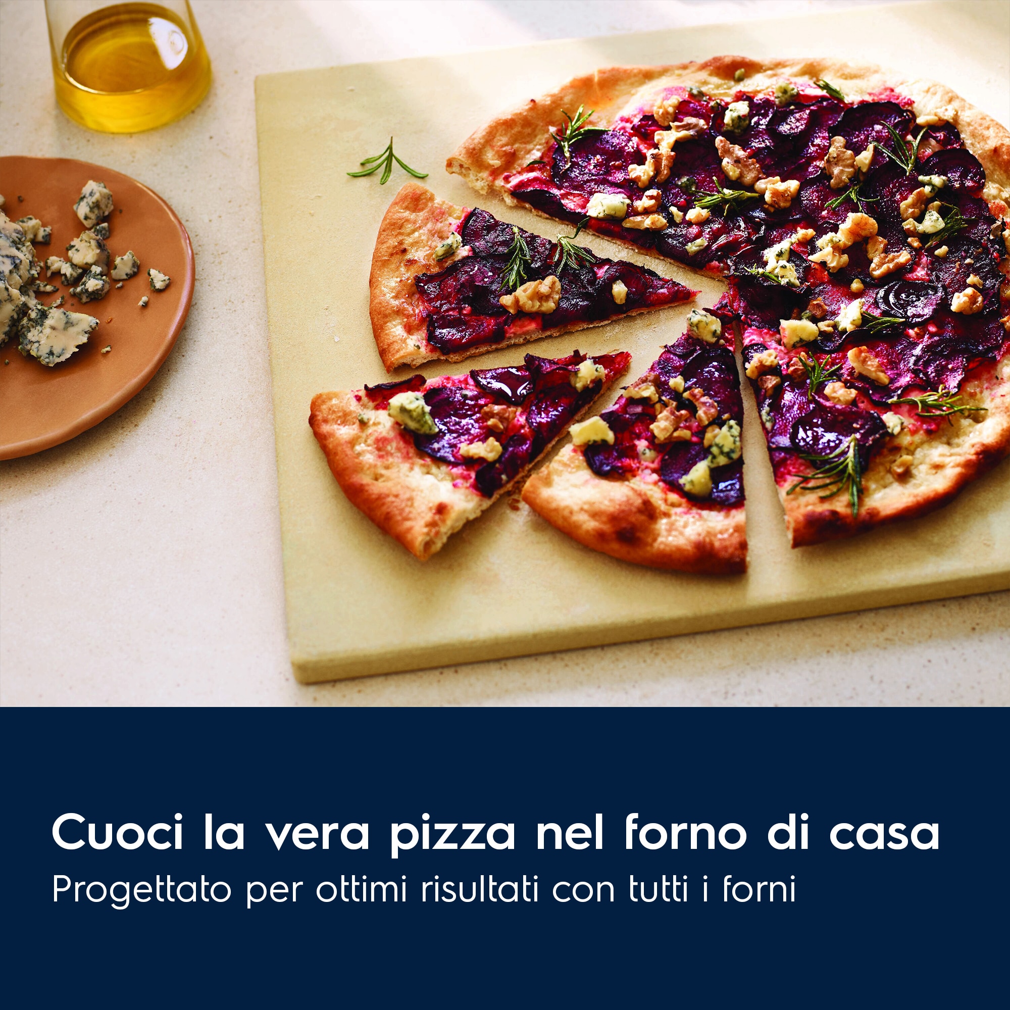 La pietra per pizza mantiene le alte temperature per trasferire calore all'impasto in modo rapido e uniforme garantendo ottimi risultati e deliziose pizze sempre croccanti. Funziona sia con pizze fatte in casa che surgelate ed è ideale per cucinare torte salate e vari tipi di pane come ad esempio la focaccia. Il Set è composto da: pietra refrattaria, paletta di legno e taglierina in acciaio inox.