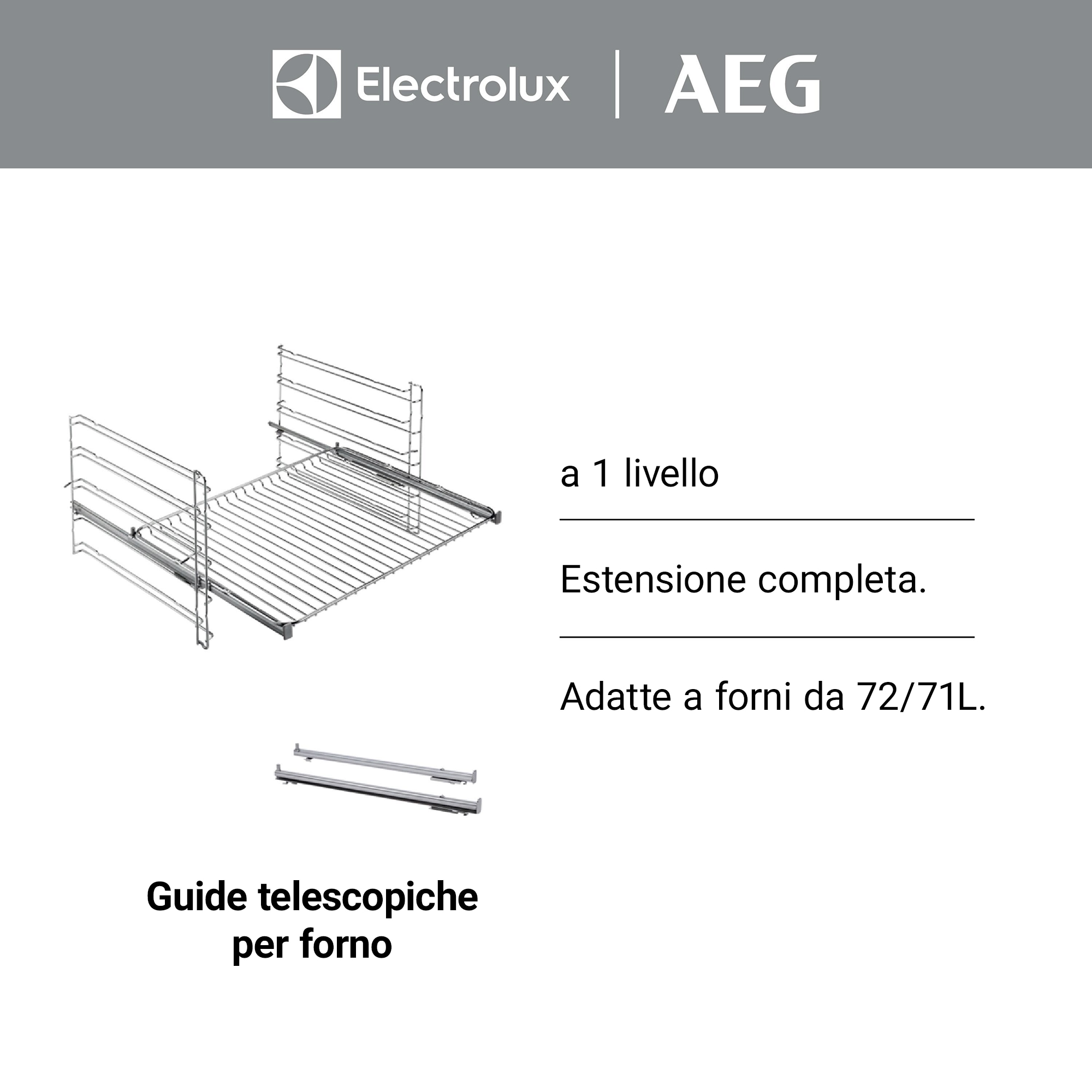 Le nostre guide telescopiche completamente estraibili rendono ancora più facile la preparazione dei tuoi piatti. Potrai comodamente estrarre le griglie: il sistema di bloccaggio impedisce che si ribaltino in avanti o scivolino fuori, agganciandosi facilmente alle guide laterali esistenti.