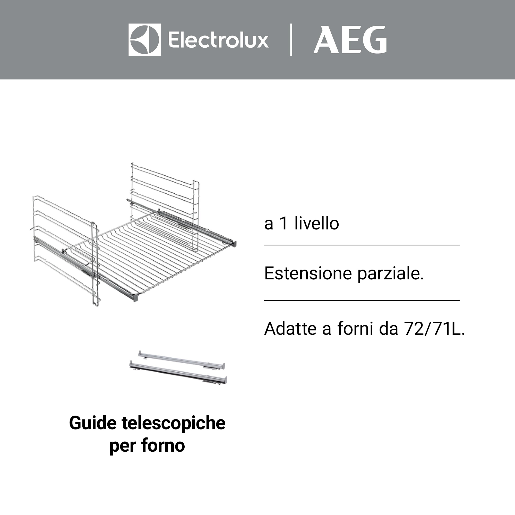 Guida telescopica per 1 livello ad estensione parziale per forni dotati di griglie laterali all'interno della cavità (Esclusi ROB2200AOX-EOB2200DOX-EOB2201DOX-ROB2100AOK-ROB2100AOW-ROB2101AOW-ROB2200AON-ROB2201AON-ROB2211AOX).Esclusi i forni 100% vapore.
