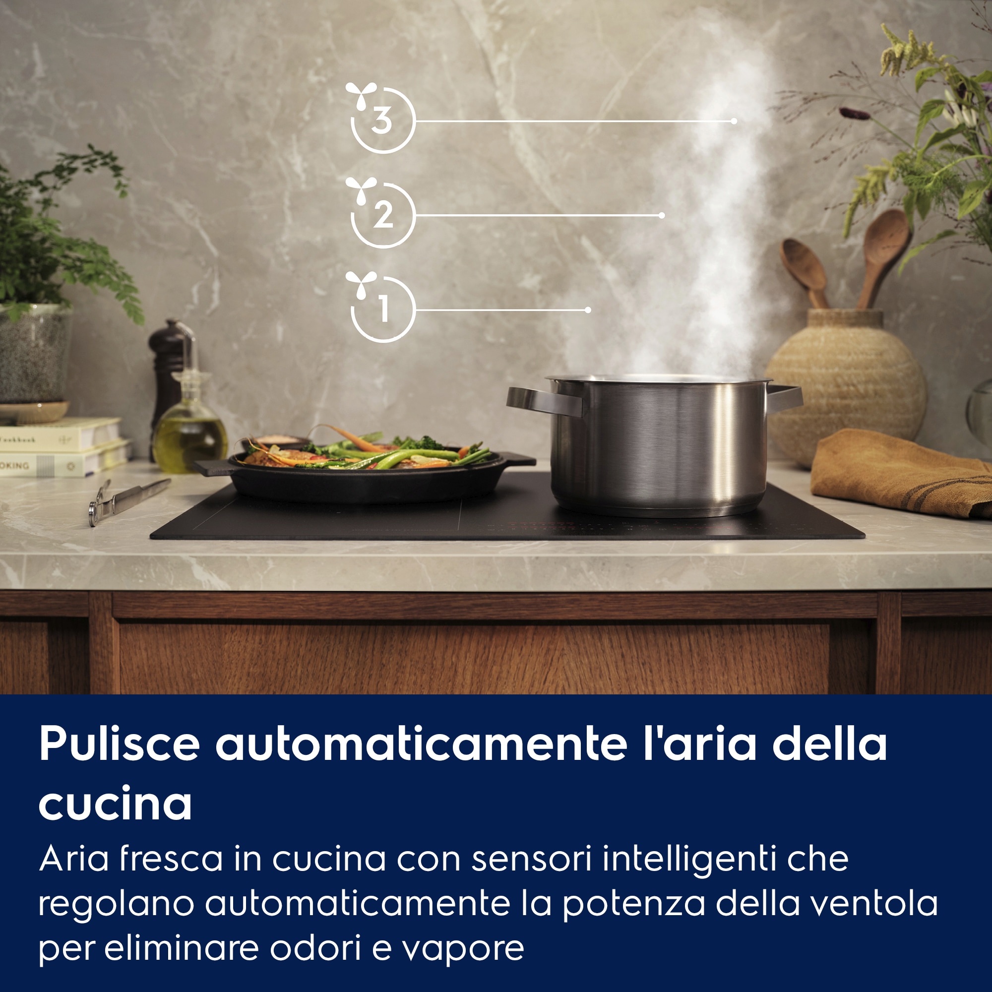 La cappa AutoSense serie 900 rileva vapore, grasso e odori in cucina e regola automaticamente la potenza della ventola per pulire l'aria velocemente.