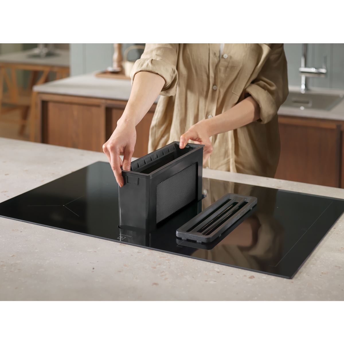 Un piano di cottura a estrazione, noto anche come piano a induzione con aspirazione integrata, combina la funzionalità di un piano di cottura con un aspiratore incorporato. Questo sistema elimina la necessità di una cappa separata, aspirando vapore, fumo e odori di cottura direttamente dal piano cottura. L'aspiratore è solitamente posizionato al centro del piano di cottura e rimuove efficacemente i vapori e le particelle di grasso dalle pentole e dalle padelle durante la cottura.