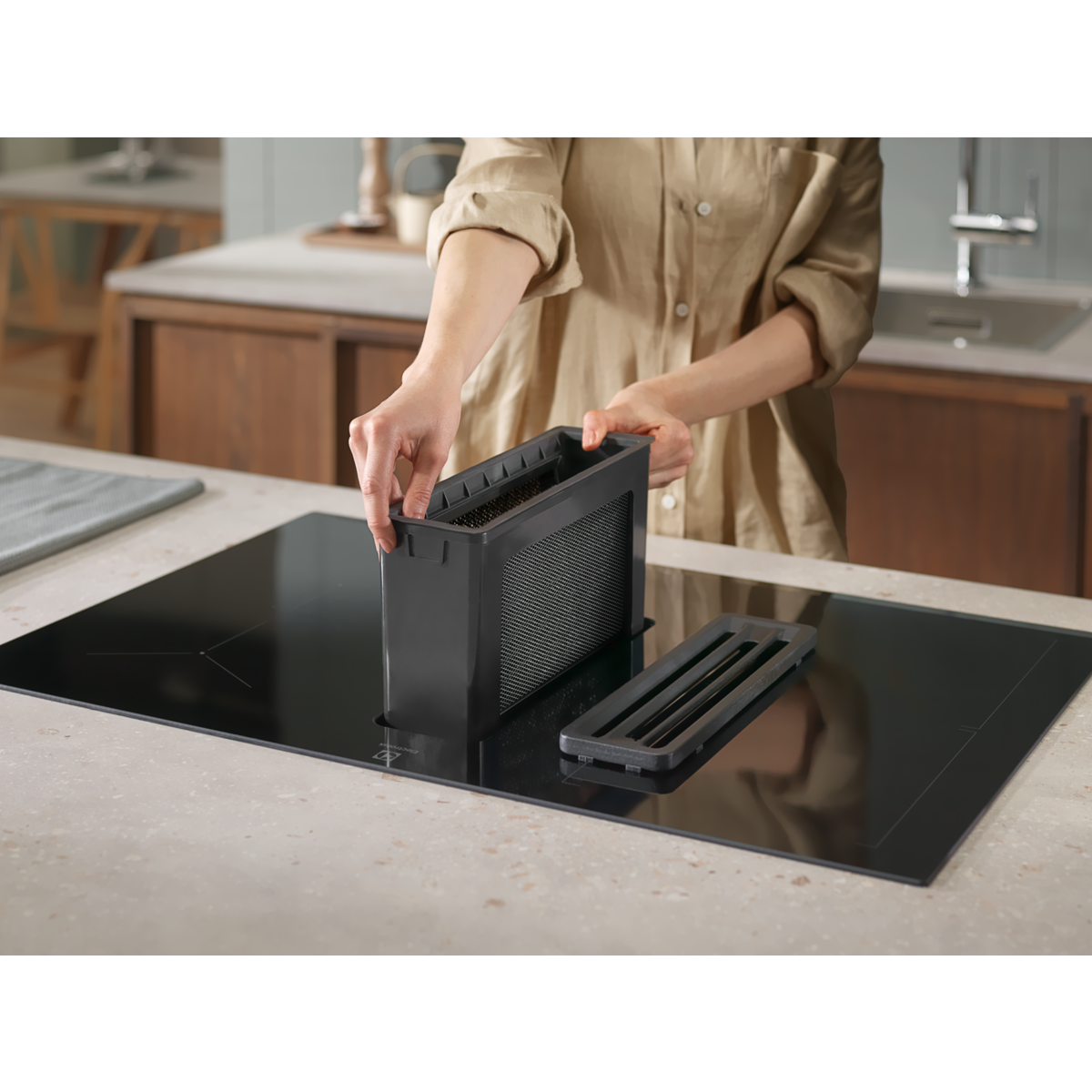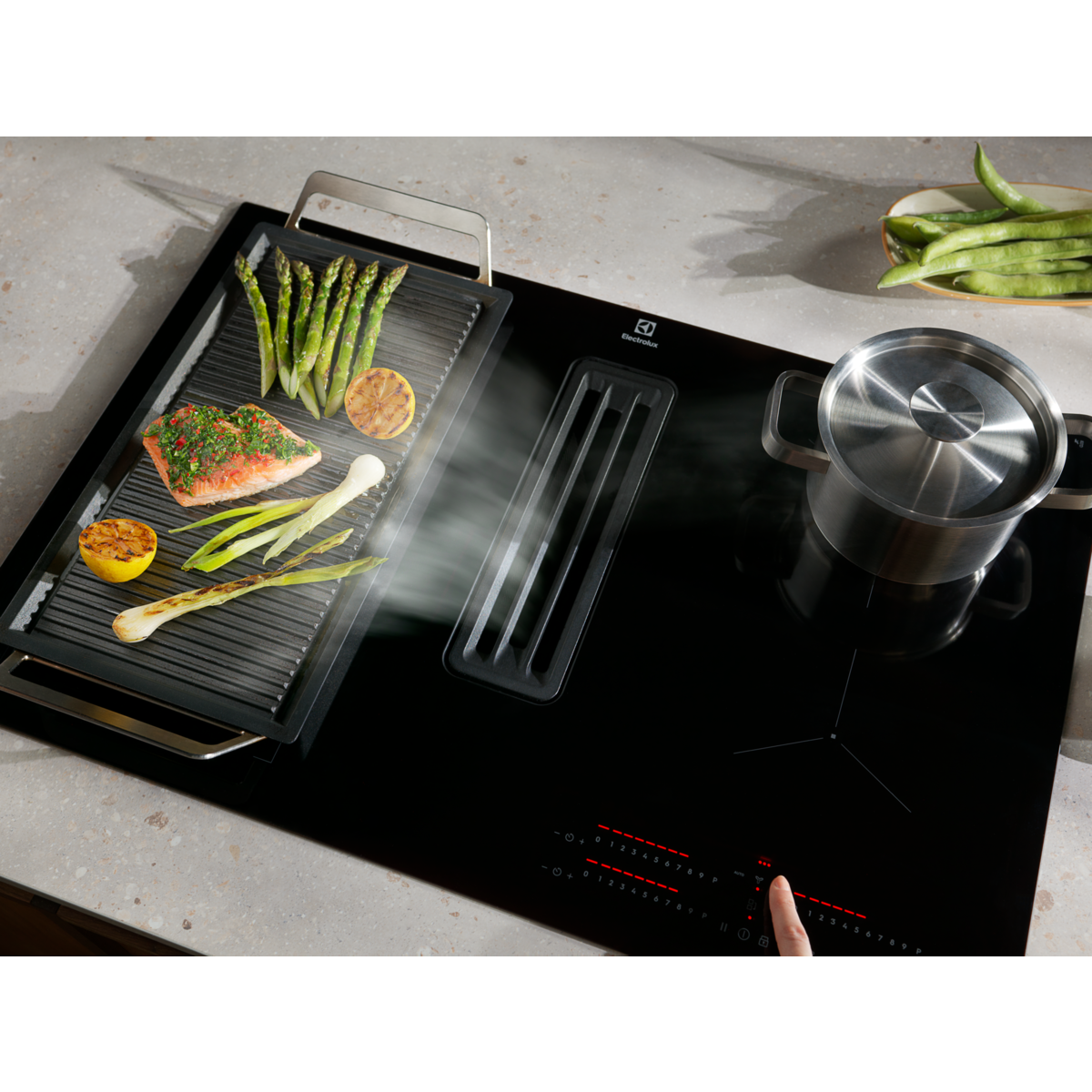 Un piano di cottura a estrazione, noto anche come piano a induzione con aspirazione integrata, combina la funzionalità di un piano di cottura con un aspiratore incorporato. Questo sistema elimina la necessità di una cappa separata, aspirando vapore, fumo e odori di cottura direttamente dal piano cottura. L'aspiratore è solitamente posizionato al centro del piano di cottura e rimuove efficacemente i vapori e le particelle di grasso dalle pentole e dalle padelle durante la cottura.