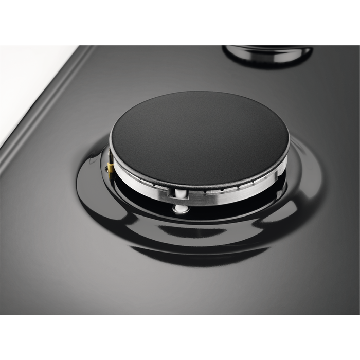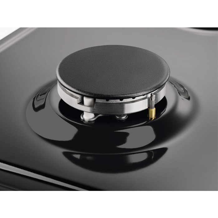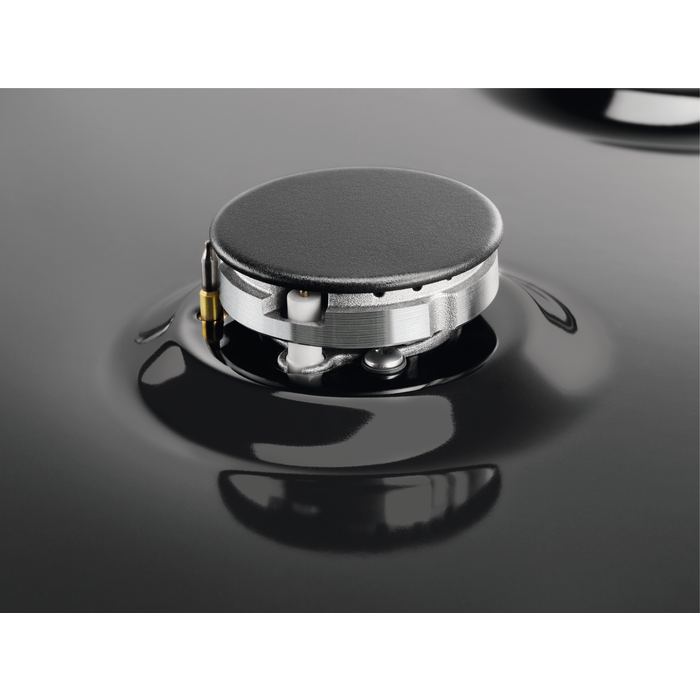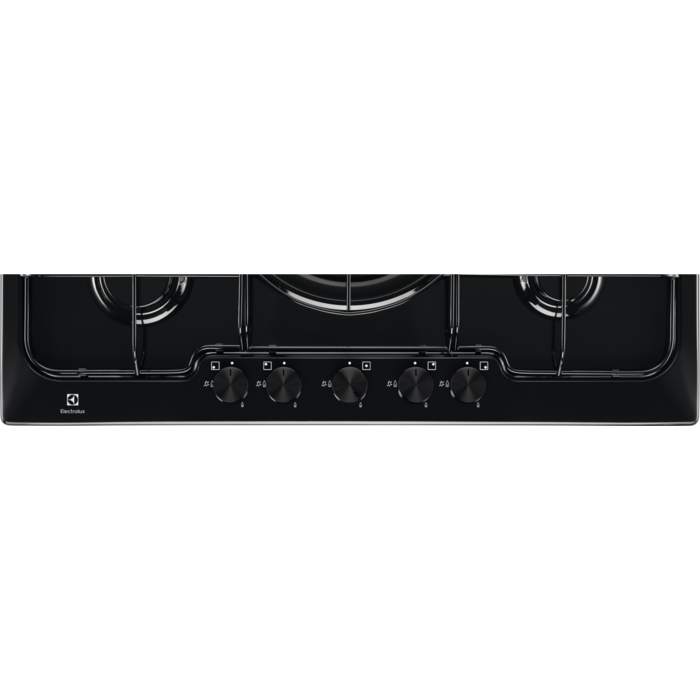Piano cottura della linea Soft in estetica nera da 75 cm con 5 fuochi gas con 1 bruciatore a tripla corona, bruciatori a fiamma pura e griglie speciali in estetica nera, per le cucine dalle linee morbide.