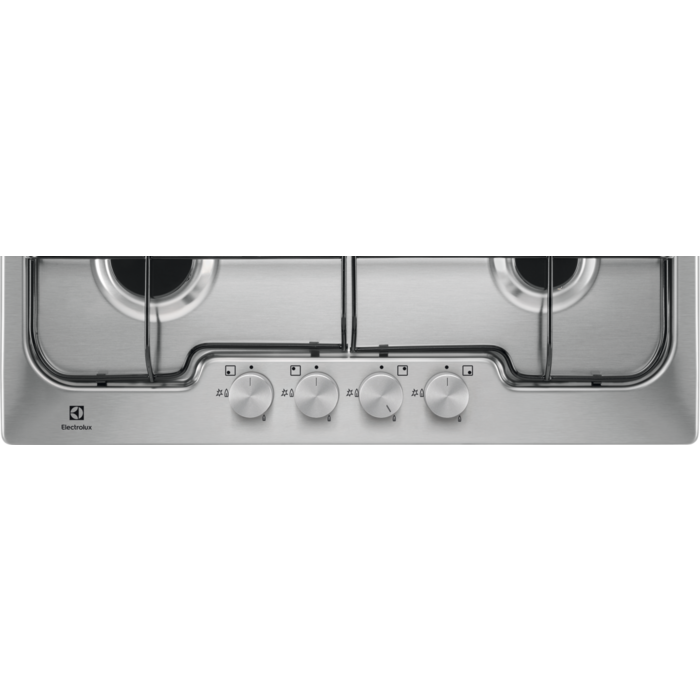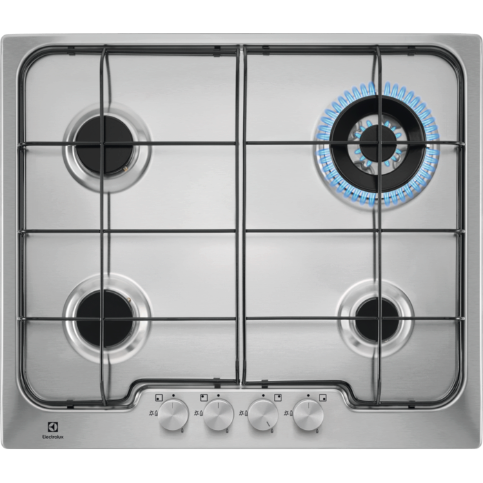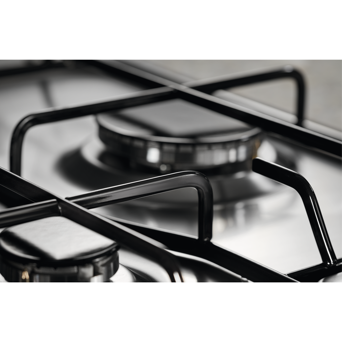 Piano cottura della linea Soft in estetica inox da 60 cm 4 fuochi gas con 1 bruciatore a tripla corona, bruciatori a fiamma pura e griglie speciali in estetica nera, per le cucine dalle linee morbide.