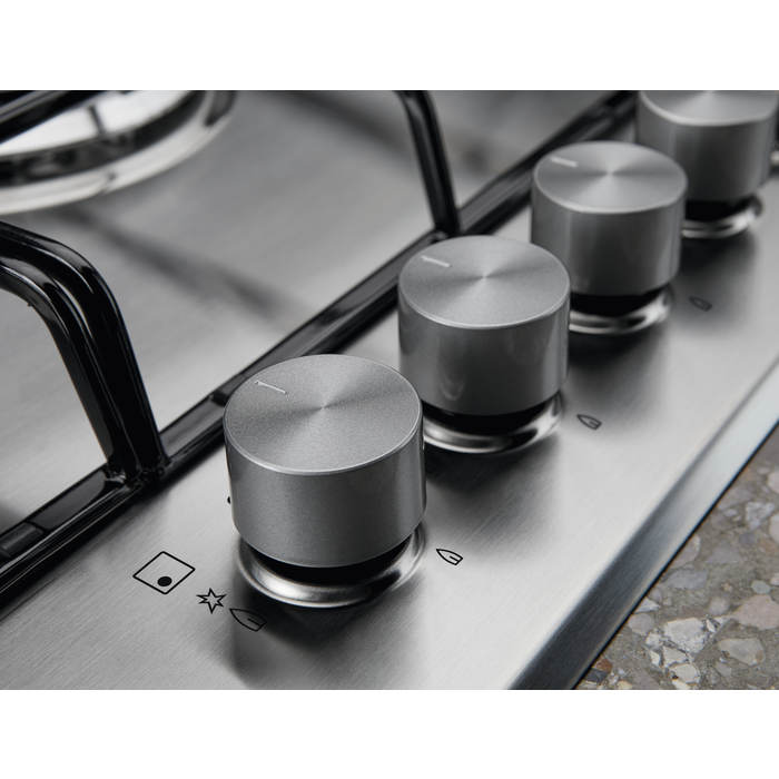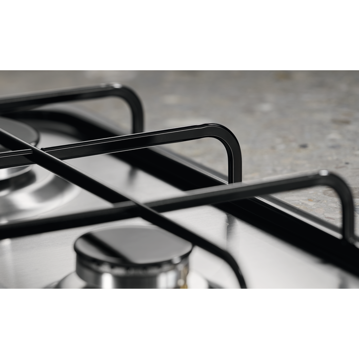 Piano cottura della linea Soft in estetica inox da 75 cm con 5 fuochi gas con 1 bruciatore Superpower, bruciatori a fiamma pura e griglie speciali in estetica nera, per le cucine dalle linee morbide.