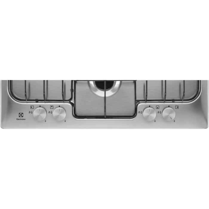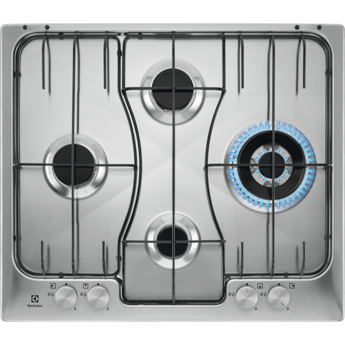 Piano cottura CrossCook della linea Soft in estetica inox da 60 cm con 4 fuochi gas con 1 bruciatore Wok a tripla corona, bruciatori a fiamma pura e griglie speciali in estetica nera, per le cucine dalle linee morbide.