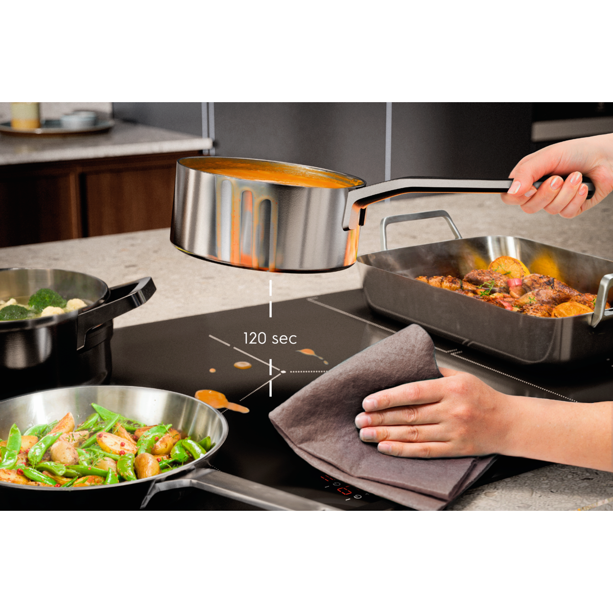 Il piano cottura a induzione Bridge 600 consente di collegare due zone cottura separate per creare un’unica, ampia superficie. Grazie all’allineamento automatico delle impostazioni di temperatura e ora, è l’ideale per sfruttare al meglio utensili come piastre e teglie.