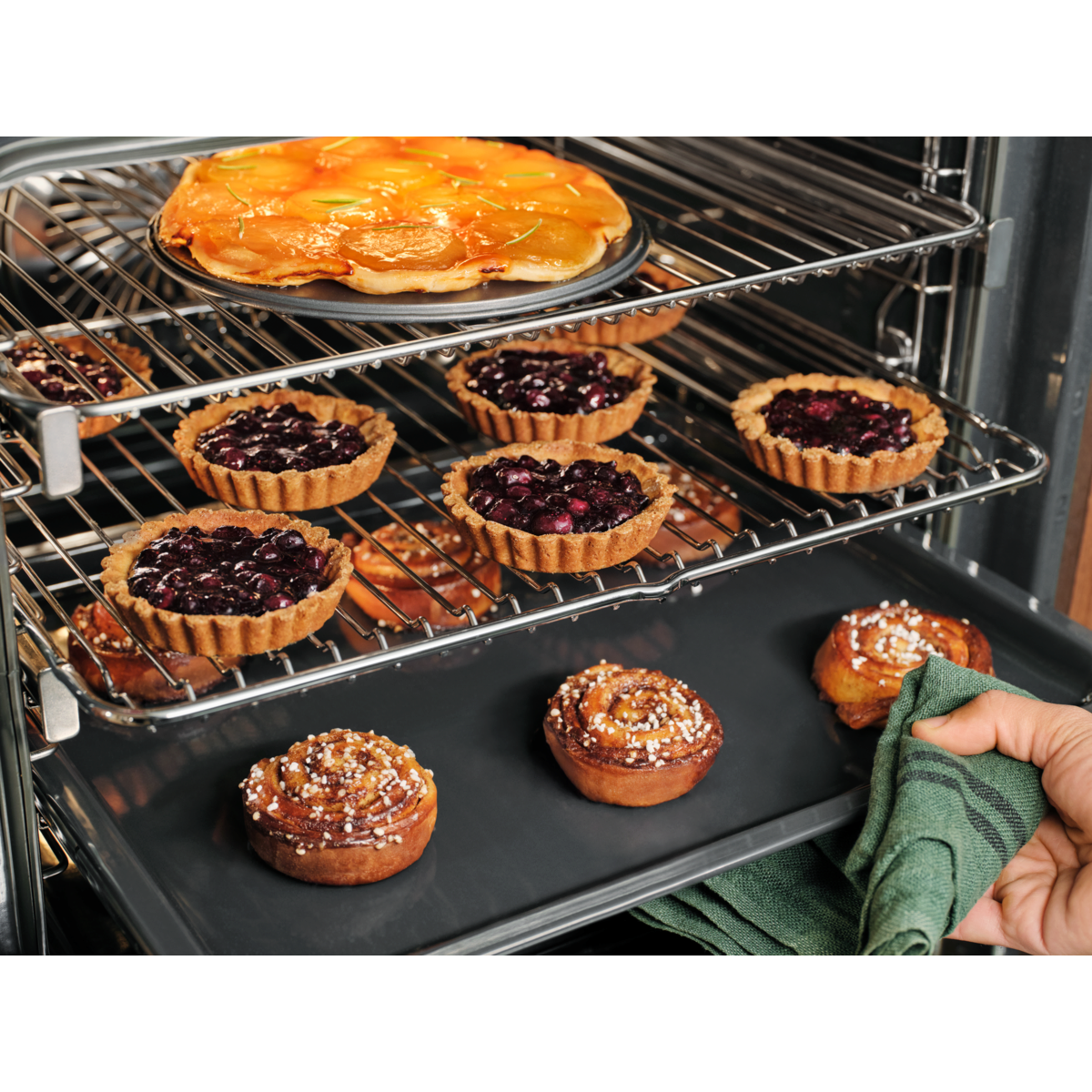 La cottura a più livelli aggiunge un terzo elemento riscaldante che consente di cuocere in modo uniforme su più livelli. Perfetto per creare tre lamiere dolci di biscotti o torte contemporaneamente.
