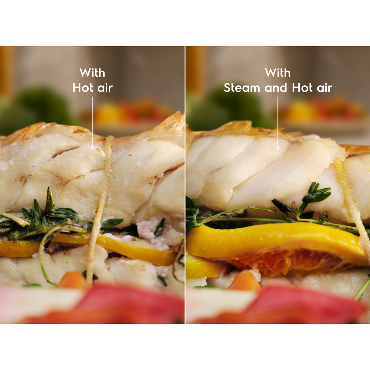 *Basato su test esterni che confrontano la tenerezza del pollo (fino al 4% in più) e del salmone (fino al 20% in più) cucinati con e senza la combinazione di vapore e aria calda.
