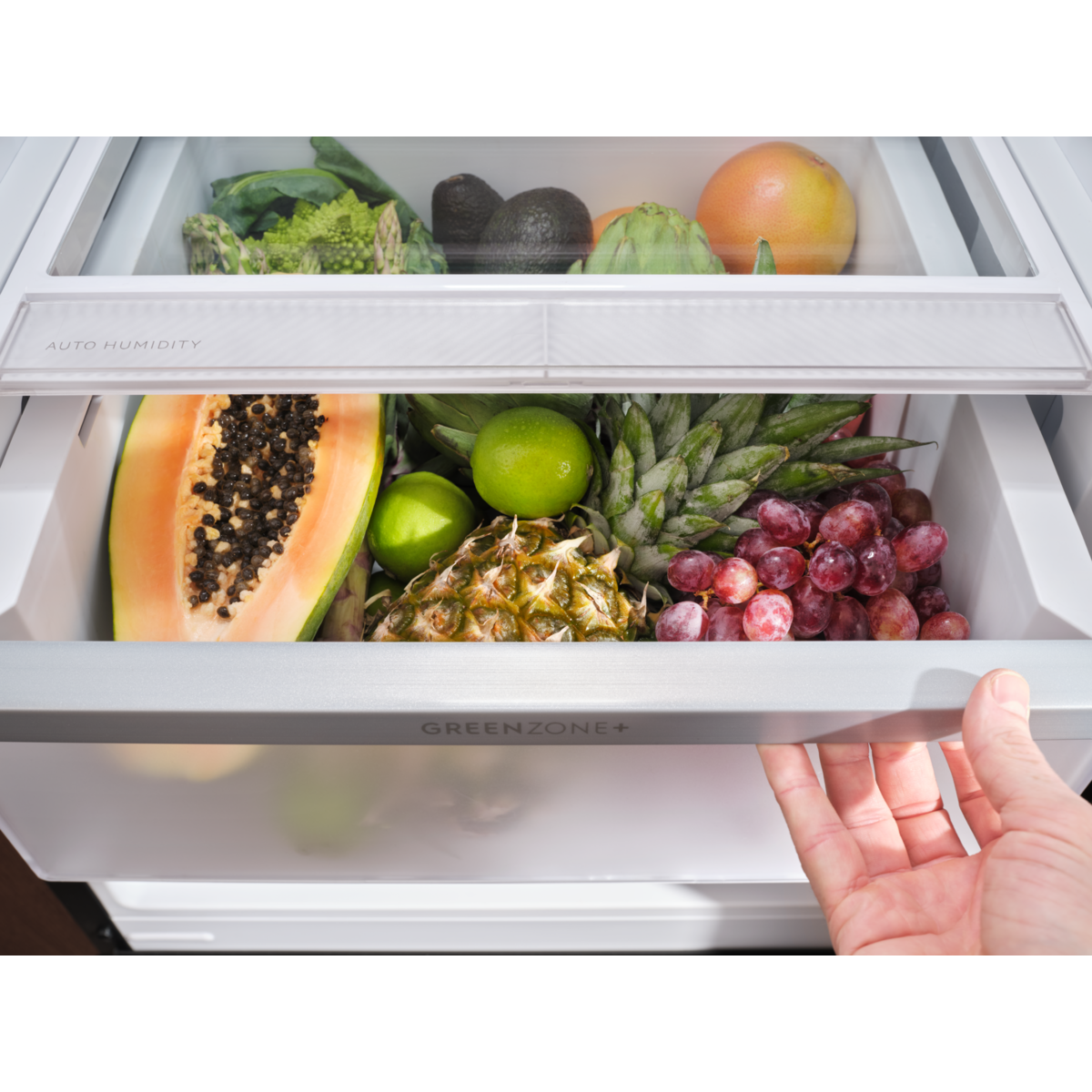 Il GreenZone+ 700 ha un cassetto sigillato che crea un ambiente ideale per proteggere frutta e verdura. La membrana antiumidità impedisce la formazione di condensa in eccesso.