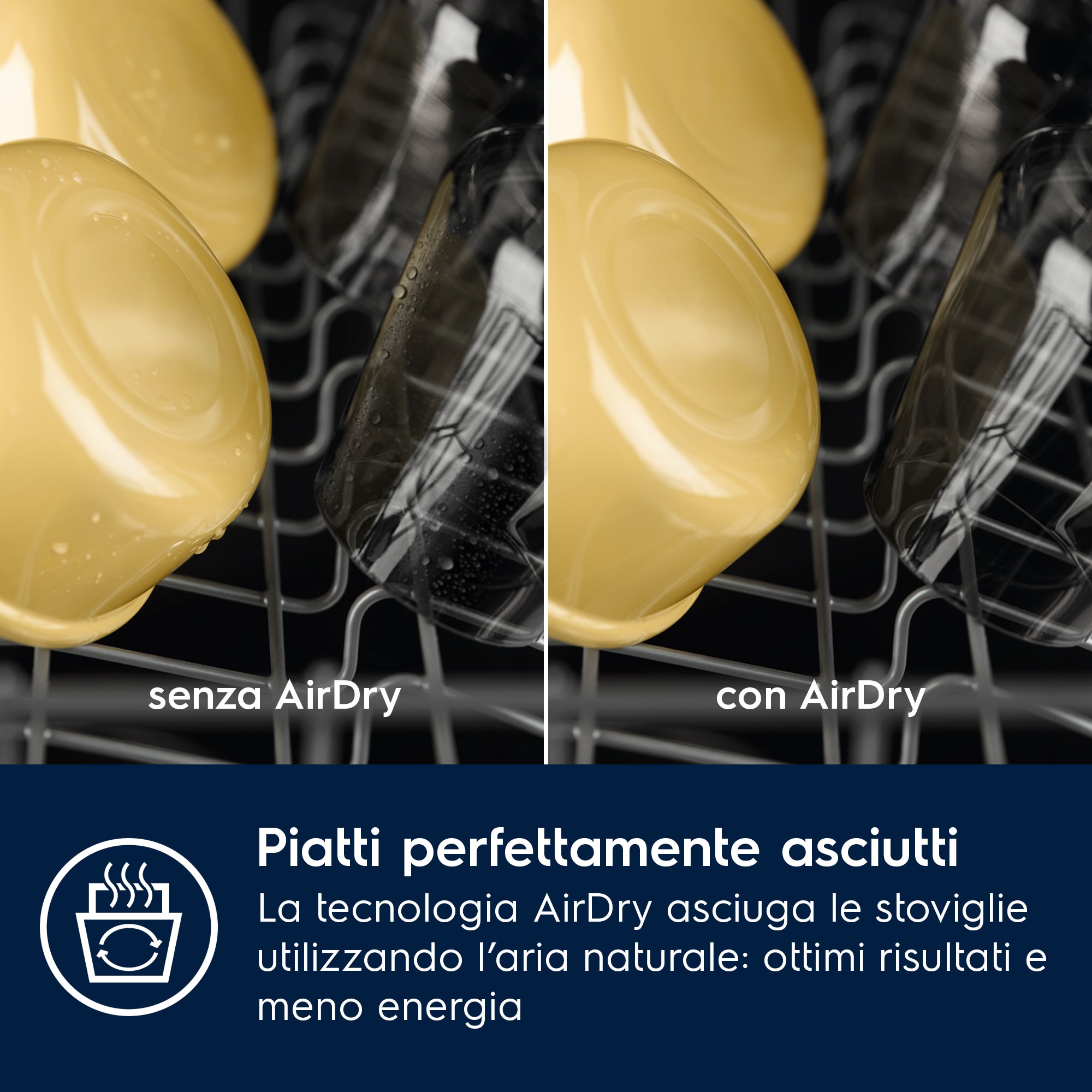 La tecnologia della lavastoviglie AirDry fa terminare ogni ciclo con una ventata di aria fresca, offrendo risultati tre volte migliori dei sistemi a porta chiusa. L'anta si apre automaticamente durante la fase di asciugatura e l'aria asciuga completamente piatti e posate.