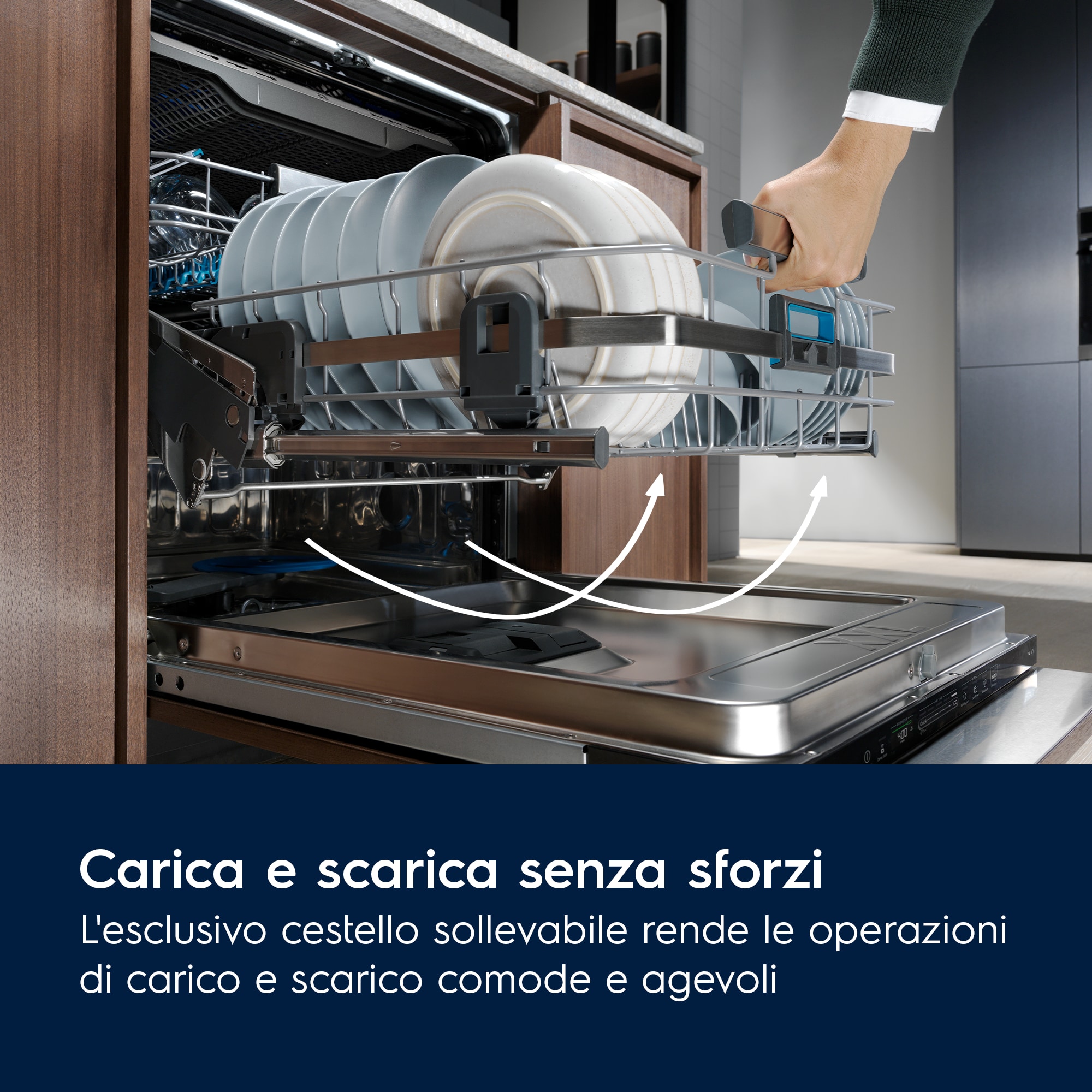 La lavastoviglie serie 900 ComfortLift® è la prima lavastoviglie al mondo che elimina lo sforzo di caricare e scaricare le stoviglie. La nostra tecnologia unica solleva il cestello inferiore con un semplice movimento. È così comodo che ti chiederai come hai fatto a farne a meno fino a oggi.
