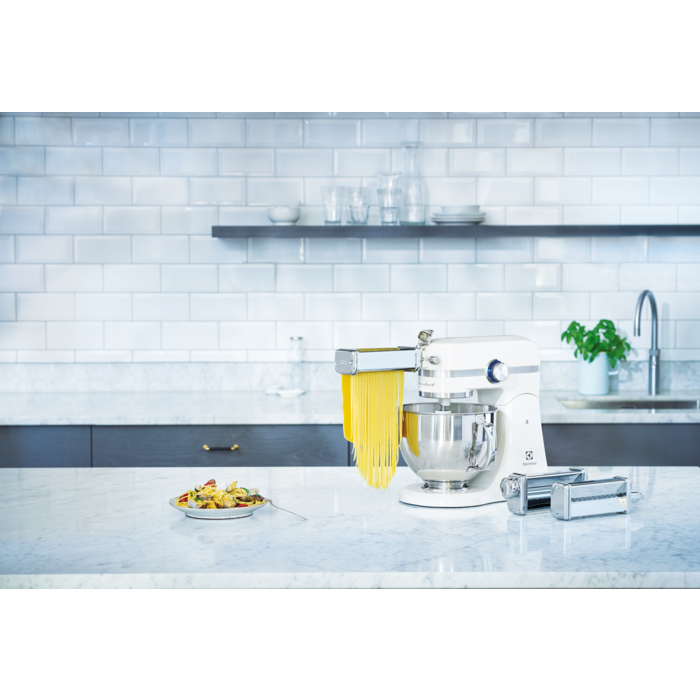 Accessorio per spaghetti per planetaria è prodotto in Italia. Realizzato in acciaio inox resistente, il tagliapasta si monta facilmente e velocemente alla parte anteriore dell’impastatrice Assistent. Rulli in lega di alluminio per alimenti, garantiscono l’assenza dall’impasto di polveri di metalli pesanti. La conformazione della superficie del rullo garantisce alla pasta la giusta porosità. Raschiatori e pettini in resina aiutano la pasta a staccarsi agevolmente dai rulli.