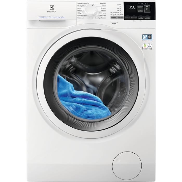 La lavasciuga PerfectCare serie 700 lava e asciuga perfettamente i tuoi capi in un unico ciclo. Il sistema DualCare rileva il tipo di tessuto e il peso del carico e regola la temperatura e il movimento del cesto garantendo il trattamento ideale per ogni indumento.