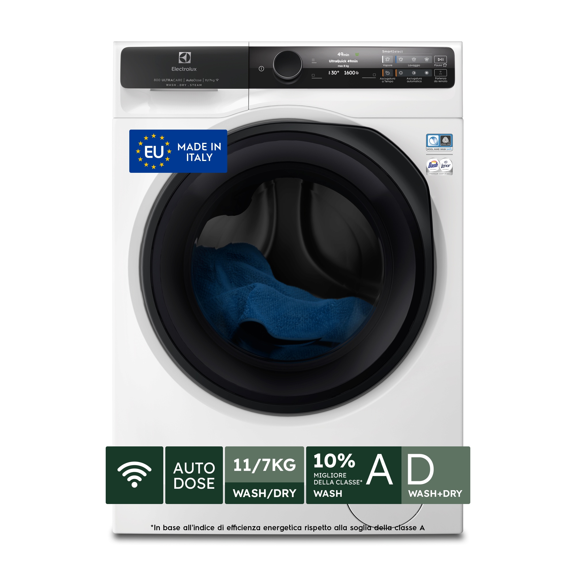 Lavaggio, asciugatura o vapore, tutto in uno. La lavasciuga 800 con tecnologia UltraCare fornisce una pulizia efficiente anche a 30°C*. Premiscela e distribuisce uniformemente detergente e ammorbidente per un’asciugatura accurata evitando il ristringimento di capi come la lana.