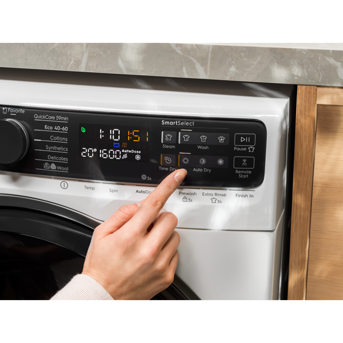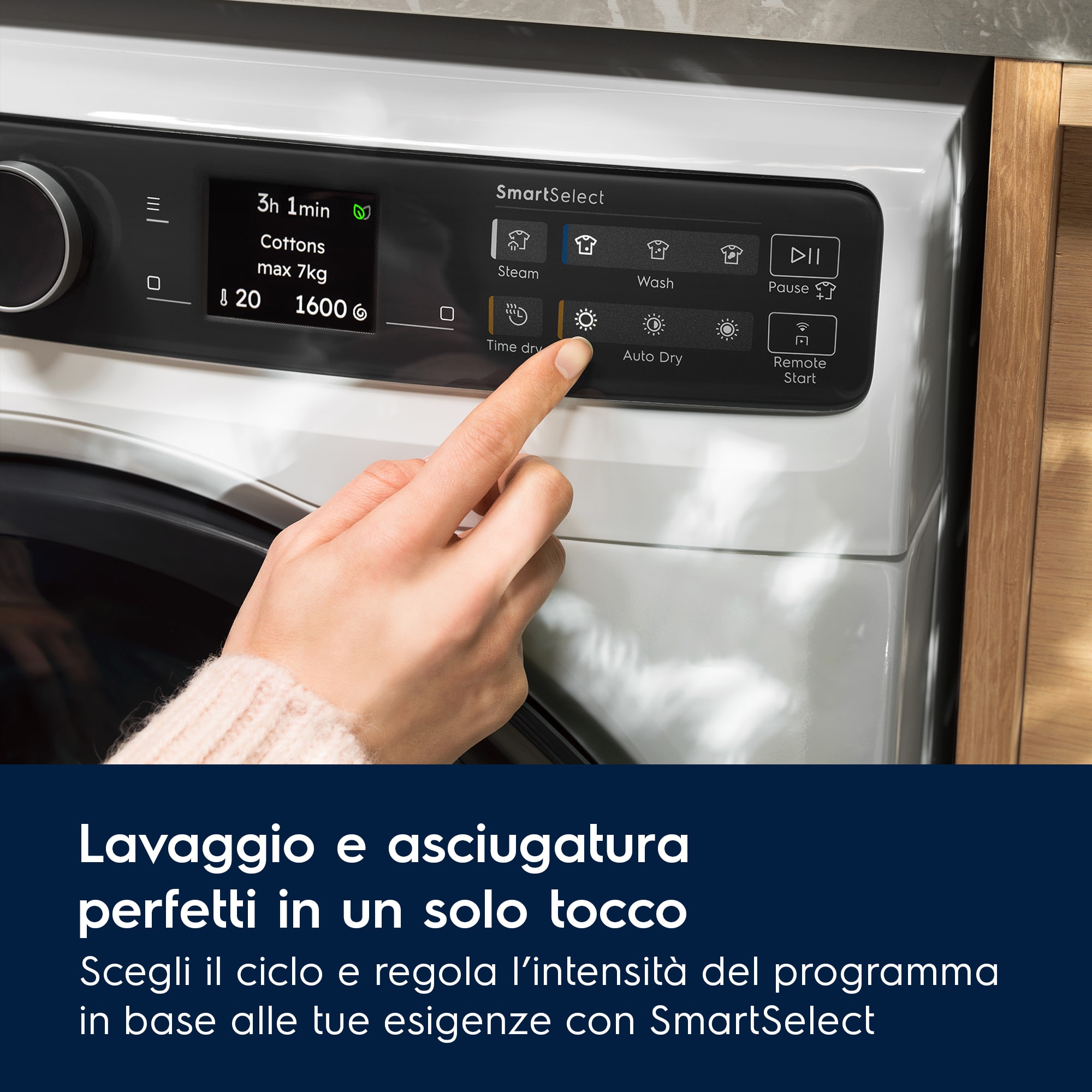 Lavaggio, asciugatura o vapore, tutto in uno. La lavasciuga 800 con tecnologia UltraCare fornisce una pulizia efficiente anche a 30°C*. Premiscela e distribuisce uniformemente detergente e ammorbidente per un’asciugatura accurata evitando il ristringimento di capi come la lana.
