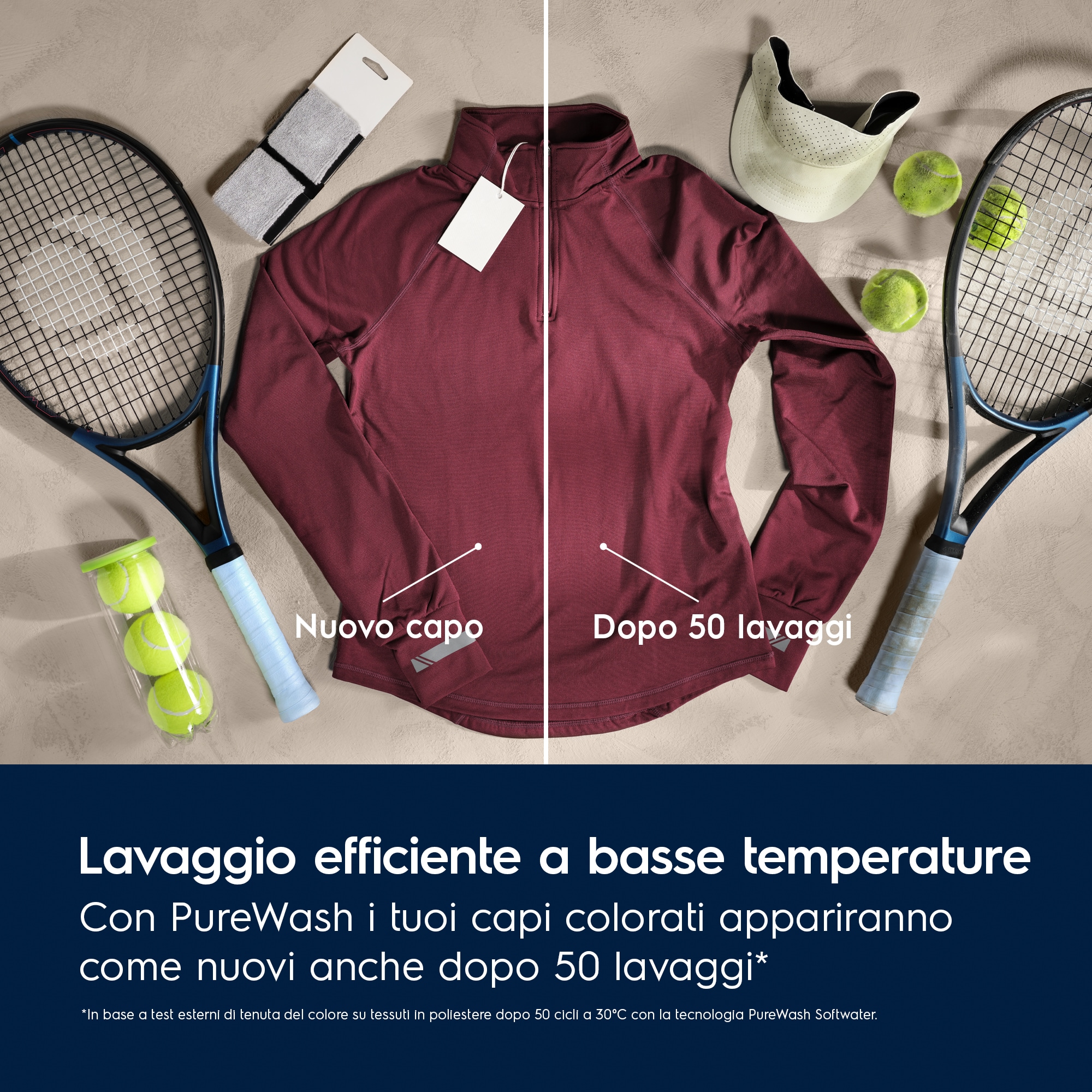 *Basato su test esterno di resistenza del colore su tessuti in poliestere dopo 50 cicli a 30°C con la tecnologia PureWash Softwater.