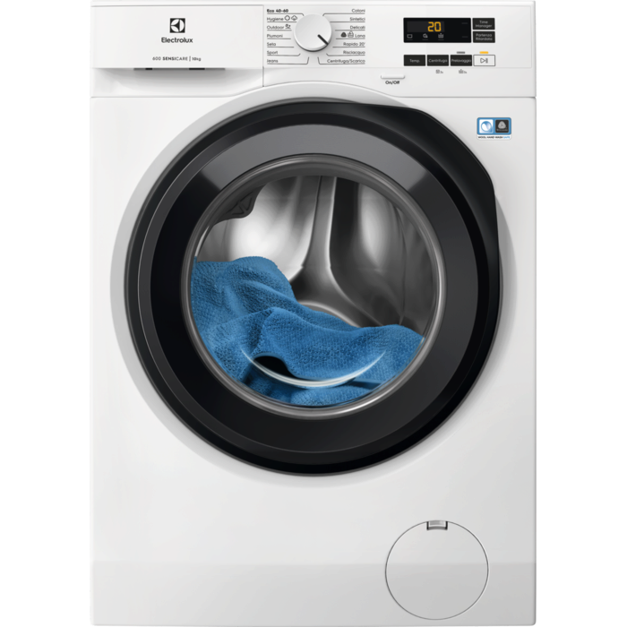 *Basato su test interni sul consumo di tempo, acqua ed energia di un carico di 1kg e il carico massimo utilizzando il ciclo Cotone 30°C ottimizzato con SensiCare.
