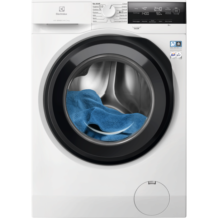 *Basato su test interni sul consumo di tempo, acqua ed energia di un carico di 1kg e il carico massimo utilizzando il ciclo Cotone 30°C ottimizzato con SensiCare.