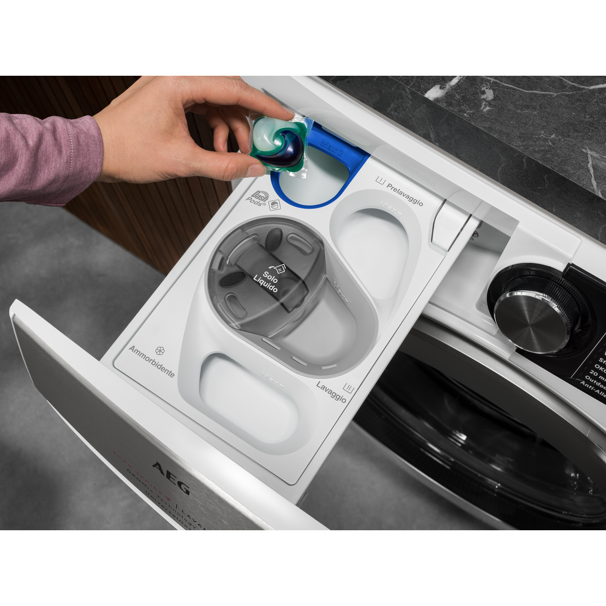 *Test interno eseguito confrontando l’inserimento della PODS® nel cassetto UniversalDose con l’inserimento della PODS® nel cesto con programma cotone di un’ora a 30°C