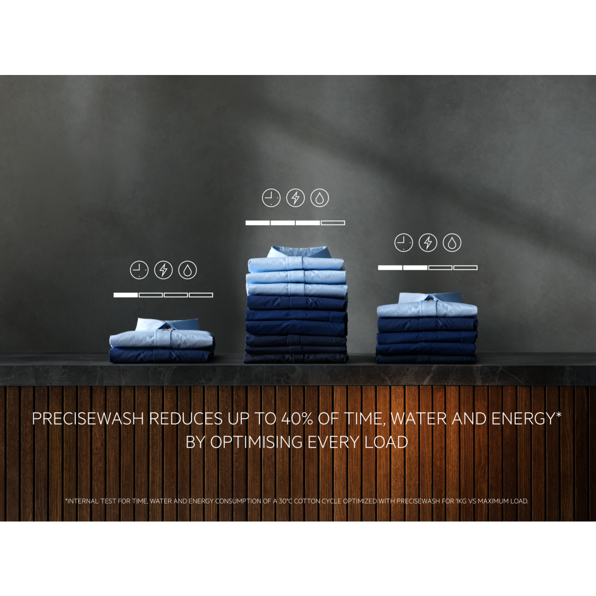 *Test interno per il consumo di tempo, acqua ed energia di un ciclo Cotone a 30°C ottimizzato con tecnologia PreciseWash per un carico di 1 kg rispetto al carico massimo