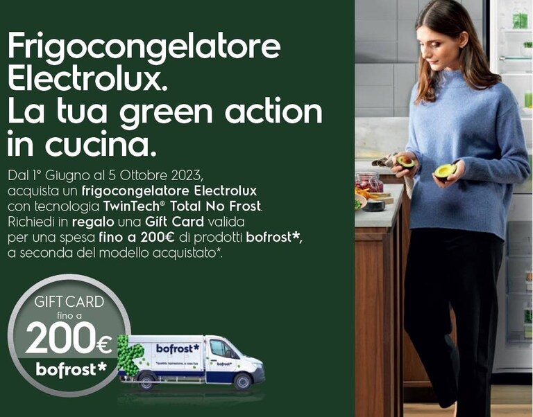 Dal 1 giugno al 5 ottobre 2023, acquista un frigocongelatore Electrolux con tecnologia TwinTech® Total No Frost. Richiedi in regalo una Gift Card valida per una spesa fino a 200€ di prodotti bofrost.