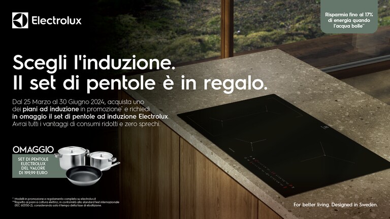 Dal 25 Marzo al 30 Giugno 2024, acquista uno dei piani ad induzione in promozione* e richiedi in omaggio il set di pentole Electrolux.