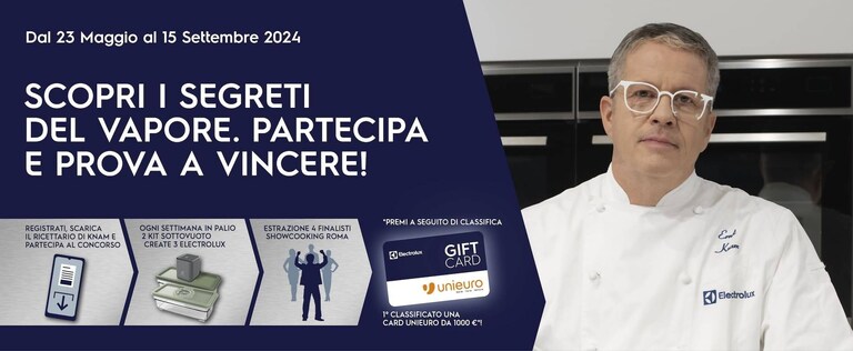 Dal 23 Maggio al 15 settembre 2024 registrati online sul sito dedicato e scarica il ricettario sui forni a vapore di Ernst Knam. Partecipa al concorso: potresti vincere uno dei 2 kit sottovuoto Electrolux in palio ogni settimana, per una cucina sana e senza sprechi ed essere tra i 4 fortunati estratti per lo showcooking alla presenza dello chef. Premi finali 4 Card Unieuro di diverso importo, per il 1 classificato una Card Unieuro da 1000€!