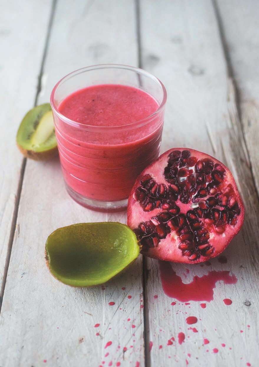 Un frullato rifrescante, ma anche ricco di nutrienti. Ottieni tutto i benefici del melograno, del kiwi, dello zenzero e non solo in questa gustosa variante.