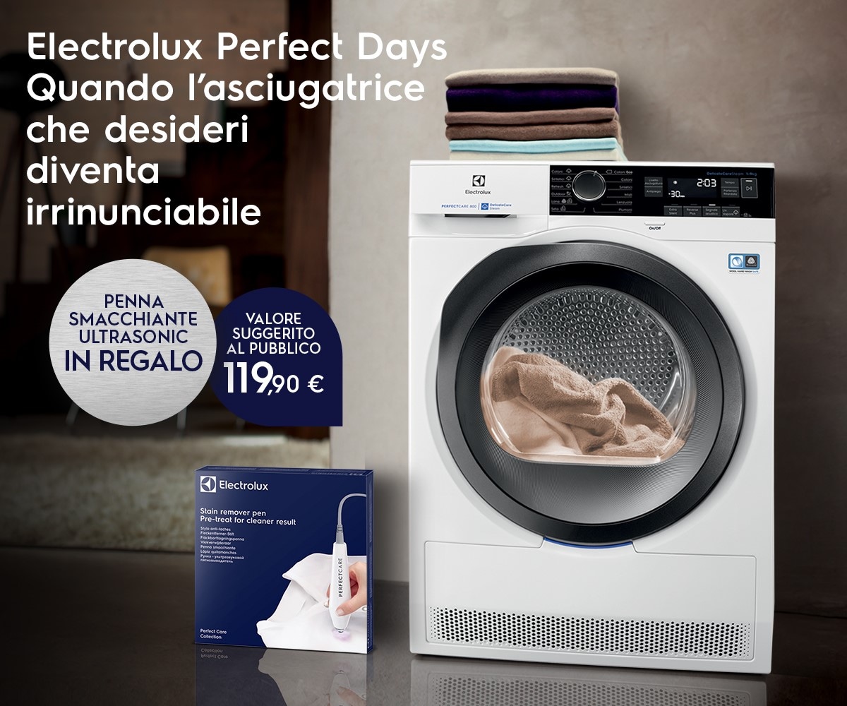 Dal 25 Ottobre al 24 Dicembre 2018 acquista un'asciugatrice della gamma PerfectCare, in omaggio per te l'unica e rivoluzionaria Penna Smacchiante Ultrasonic, del valore al pubblico di 119,90 €