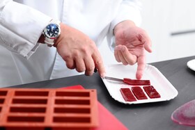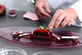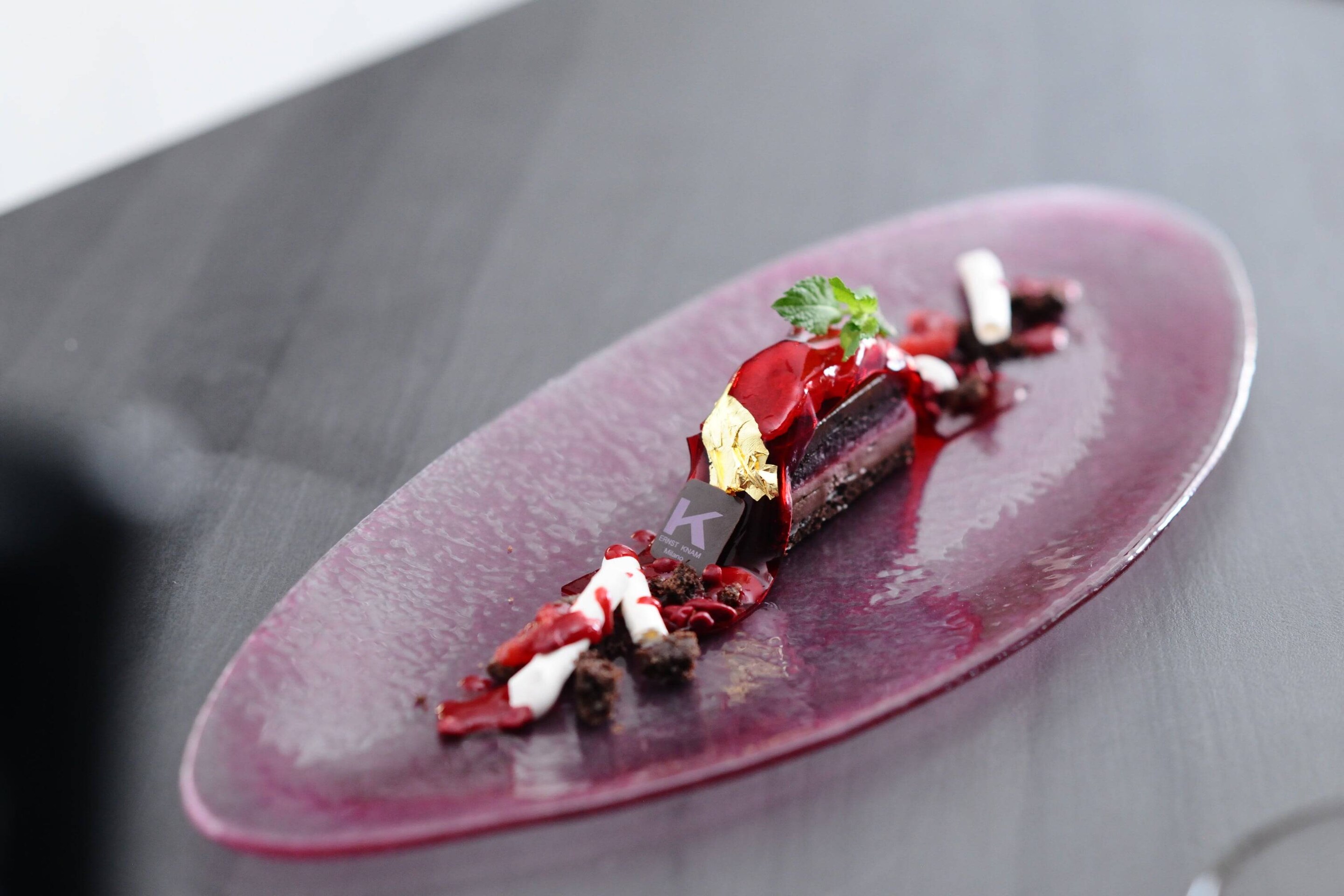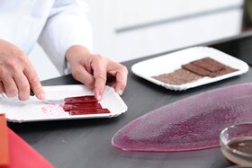 Stratificare con: crema di melanzana, un rettangolo di marquise, la gelatina di lamponi, 2/3 mm di mousse al cioccolato, il croccante di riso soffiato, 1 cm di mousse al cioccolato, 2/3 mm di ganache al cioccolato e chiudere con un rettangolo di marquise.