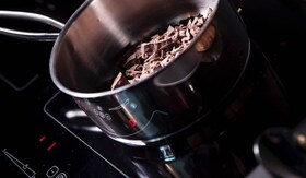 Sciogliere il cioccolato in un pentolino direttamente sul piano di cottura a induzione con calore moderato oppure in una scodella posta su una pentola di acqua bollente. Aggiungere mezzo cucchiaino di estratto di vaniglia e nettare di noce di cocco. Lasciare che il cioccolato si raffreddi mentre si prepara il passaggio successivo.