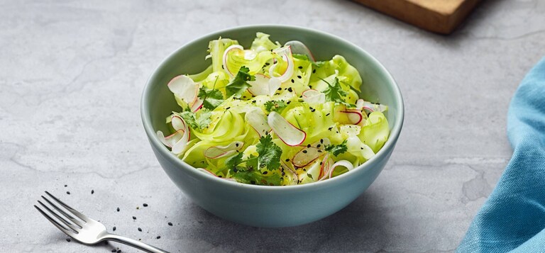 1. Taglia finemente gli steli dei broccoli e il radicchio con un pelacarote o un mandoline slicer.