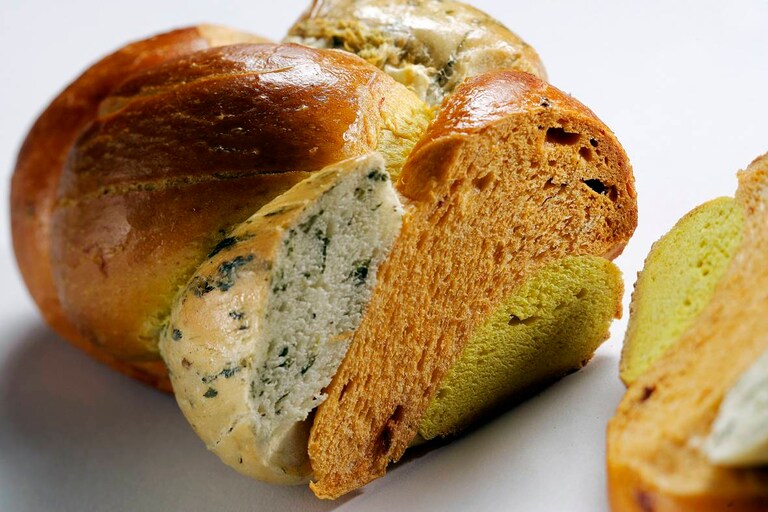 6. Mettere gli impasti in sacchetti di plastica differenti e lasciar lievitare per circa un'ora. Quindi da ogni impasto formare due rotoli di ca. 40 cm. Formare due trecce rispettivamente da un rotolo verde, uno rosso e uno giallo. Disporre su una teglia (professionale).