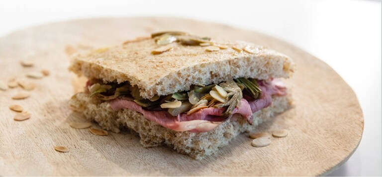 Imbottire la focaccia con roastbeef, carciofi e completarla con le mandorle a fettine.