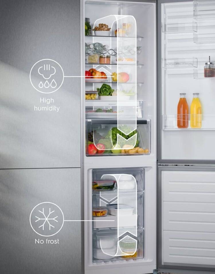 La tecnologia avanzata di raffreddamento doppio e la circolazione indipendente dell’aria assicurano che l’aria secca del congelatore non venga utilizzata per raffreddare il frigorifero, come avviene invece nei modelli Total No Frost standard. Inoltre, un congelatore completamente No Frost significa che non dovrai mai più sbrinarlo.