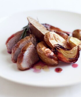 Ingredienti: 500 g di patate novelle, 2 cipolle, 800 g di filetto di maiale, sale e pepe, 1 cucchiaio di olio, 60 g di burro, 4 rametti di rosmarino, 2 spicchi d'aglio piccoli.