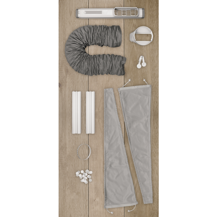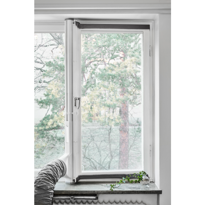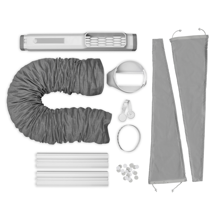 Premium Window Kit per sigillare finestre e porte. Kit completo per collegare il condizionatore portatile a finestre scorrevoli, con cerniere superiori e laterali. Adatto a telai di finestre da 5 a 147 cm con la possibilità di estendere altri 35 cm con il kit di estensione. Adatto a tubi con diametro da 150 mm. Il Kit è composto da: N.1 Kit scorrevole per finestre + N.1 connettore + 2 tele per finestre; N.2 estensioni per finestre + N.1 copri tubo (diametro 150 mm).