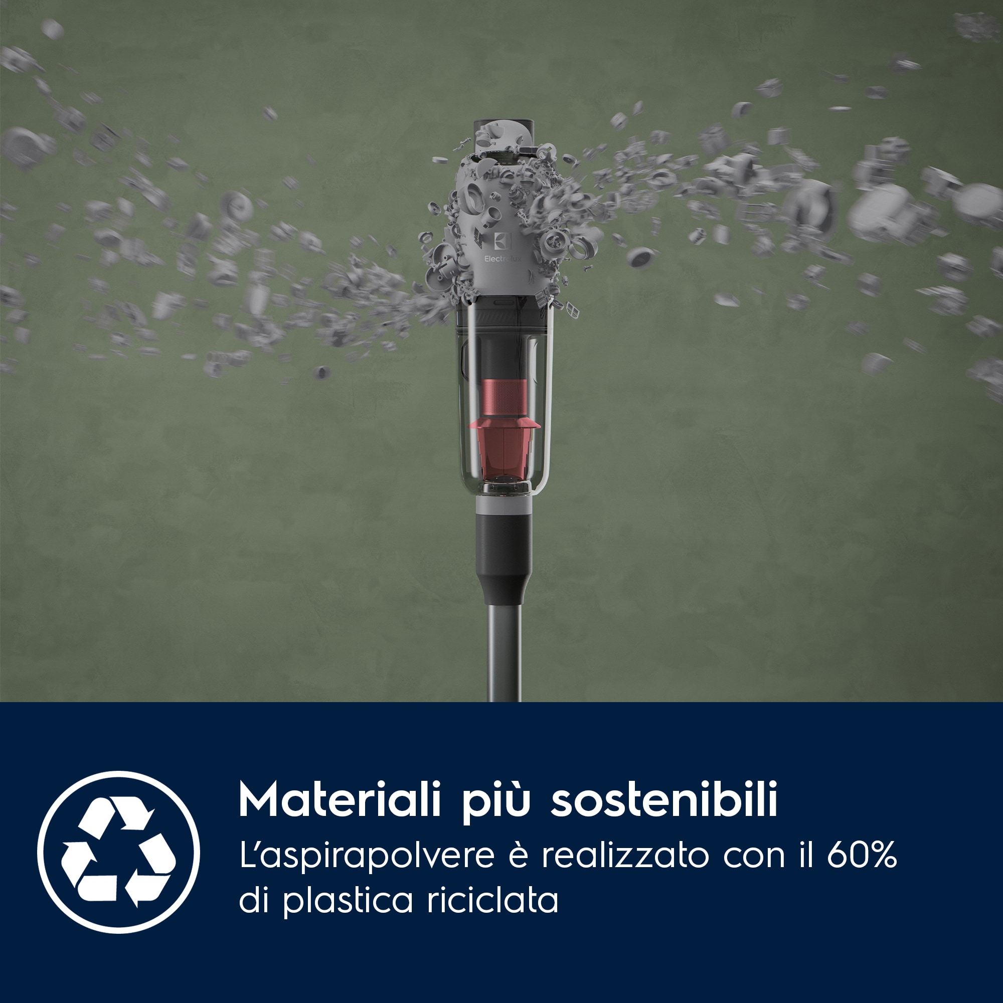 Questo aspirapolvere senza fili Electrolux è uno dei nostri aspirapolvere più efficienti che consente di risparmiare fino al 47% di energia* prolungando l'autonomia con la modalità automatica. L'aspirapolvere, la bocchetta principale e il supporto di ricarica sono realizzati con fino al 60% di plastica riciclata da tutte le plastiche utilizzate** La gamma di aspiratori senza filo Electrolux EcoLine è selezionata in base alla funzione Auto Mode che può aiutare i consumatori a risparmiare energia durante l'uso.