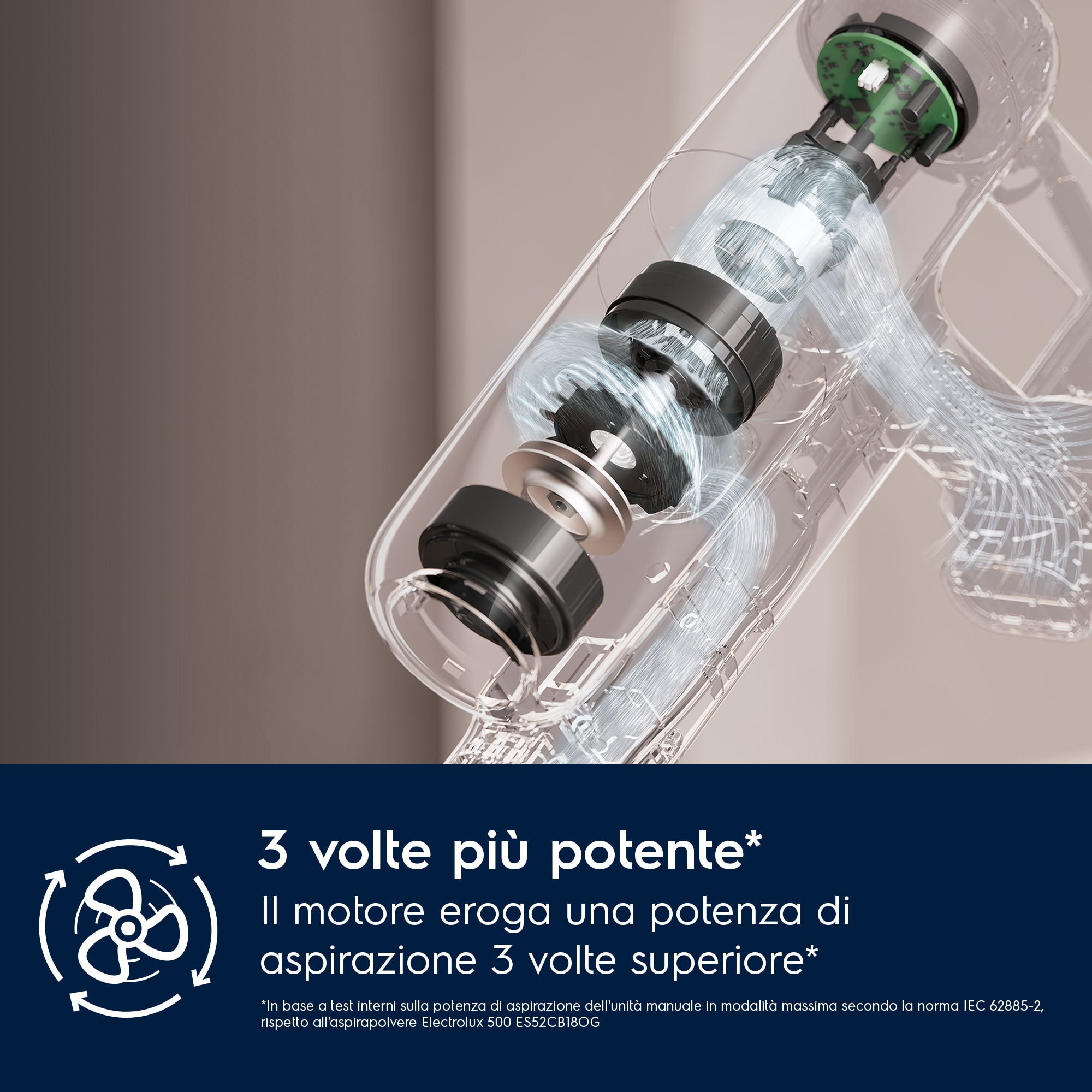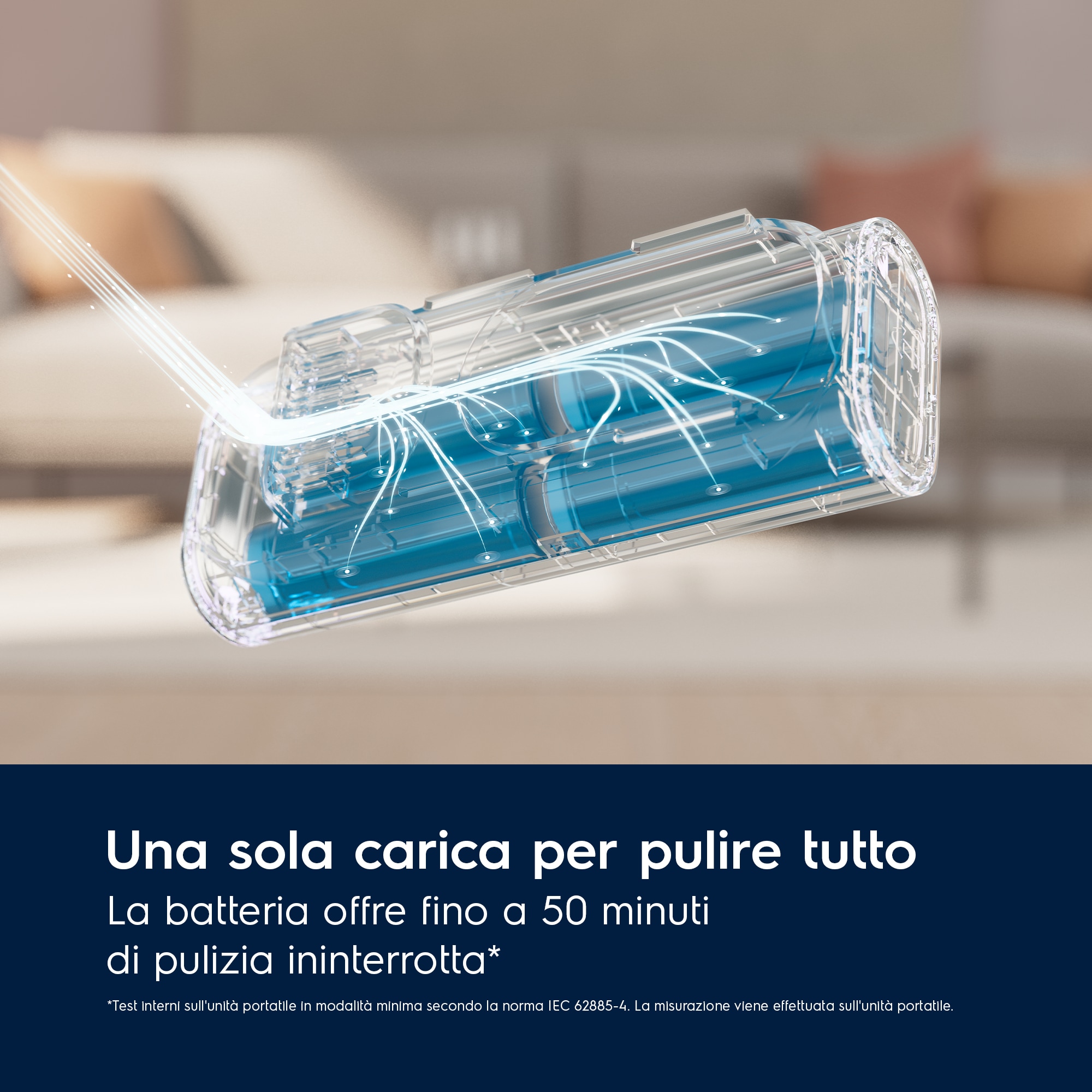 *Basato su test esterni secondo lo IEC 62885-4 con IEC 62885-2, 2021 con un risultato medio calcolato per la pulizia del pavimento secondo 5.2, 5.3 (entrambe direzioni) 5.4 e 5.5 (entrambe direzione). **In comparazione con i 3 venditori in 17 paesi europei con prezzo da EUR 300 a 379 (gFK 2021).