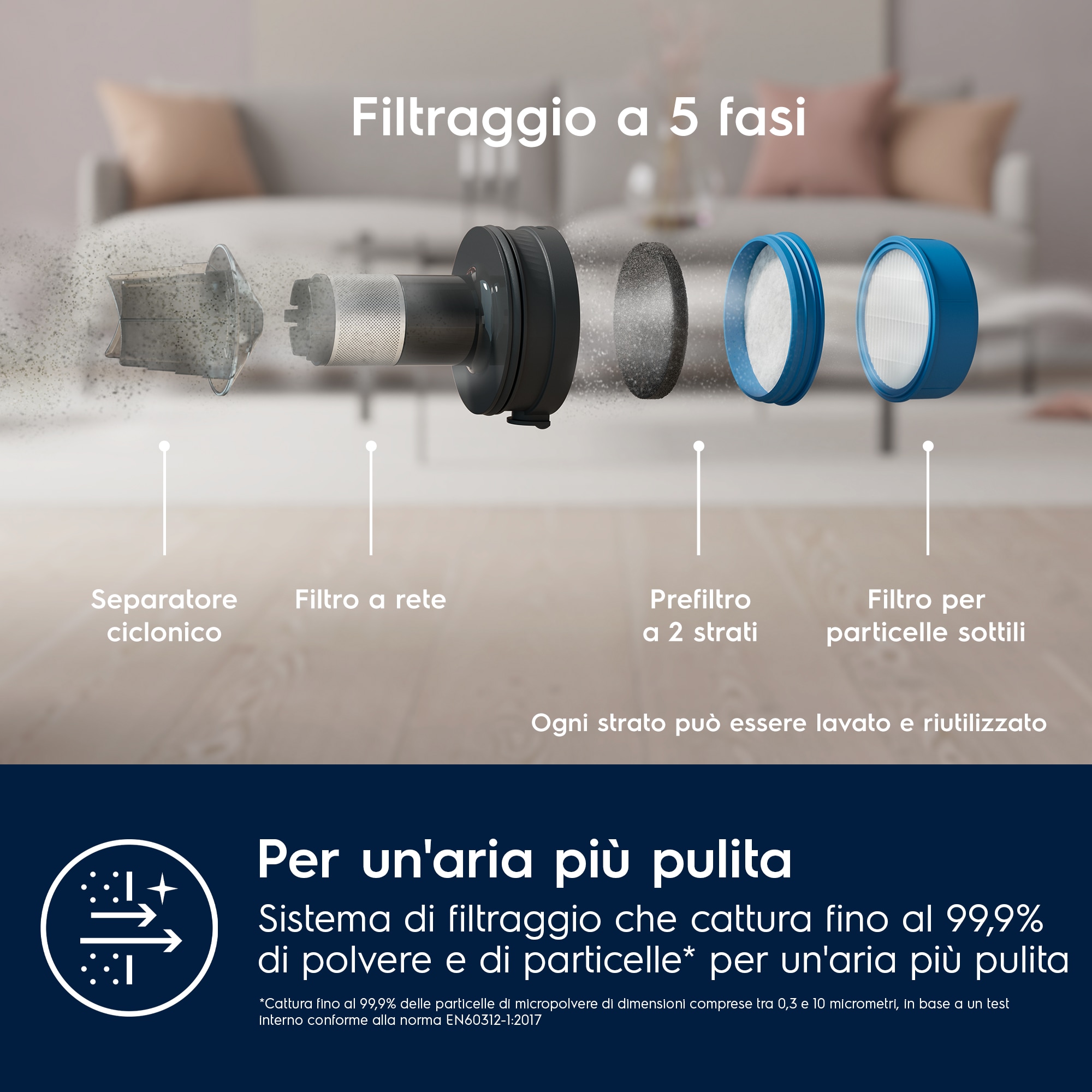 Il sistema di filtraggio a 5 strati cattura fino al 99,9% delle particelle.****