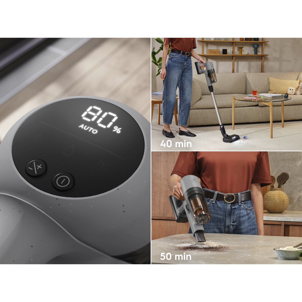 *Basato su test interni secondo lo standard IEC 62885-4 che misura il tempo di funzionamento dell’unità manuale e dell’aspirapolvere completo in modalità minima.