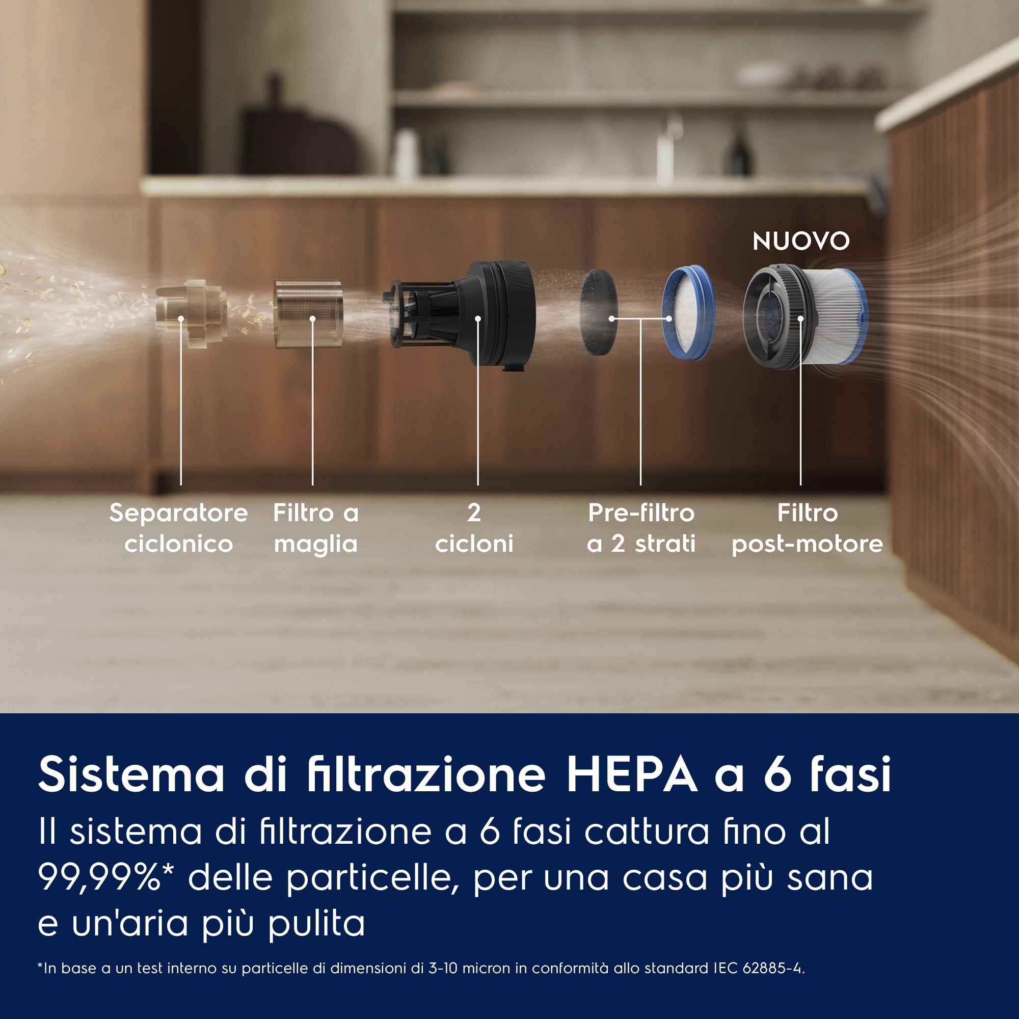 Basato su test interni su particelle di dimensioni 0,3-10 micron secondo lo standard IEC 62885-4.