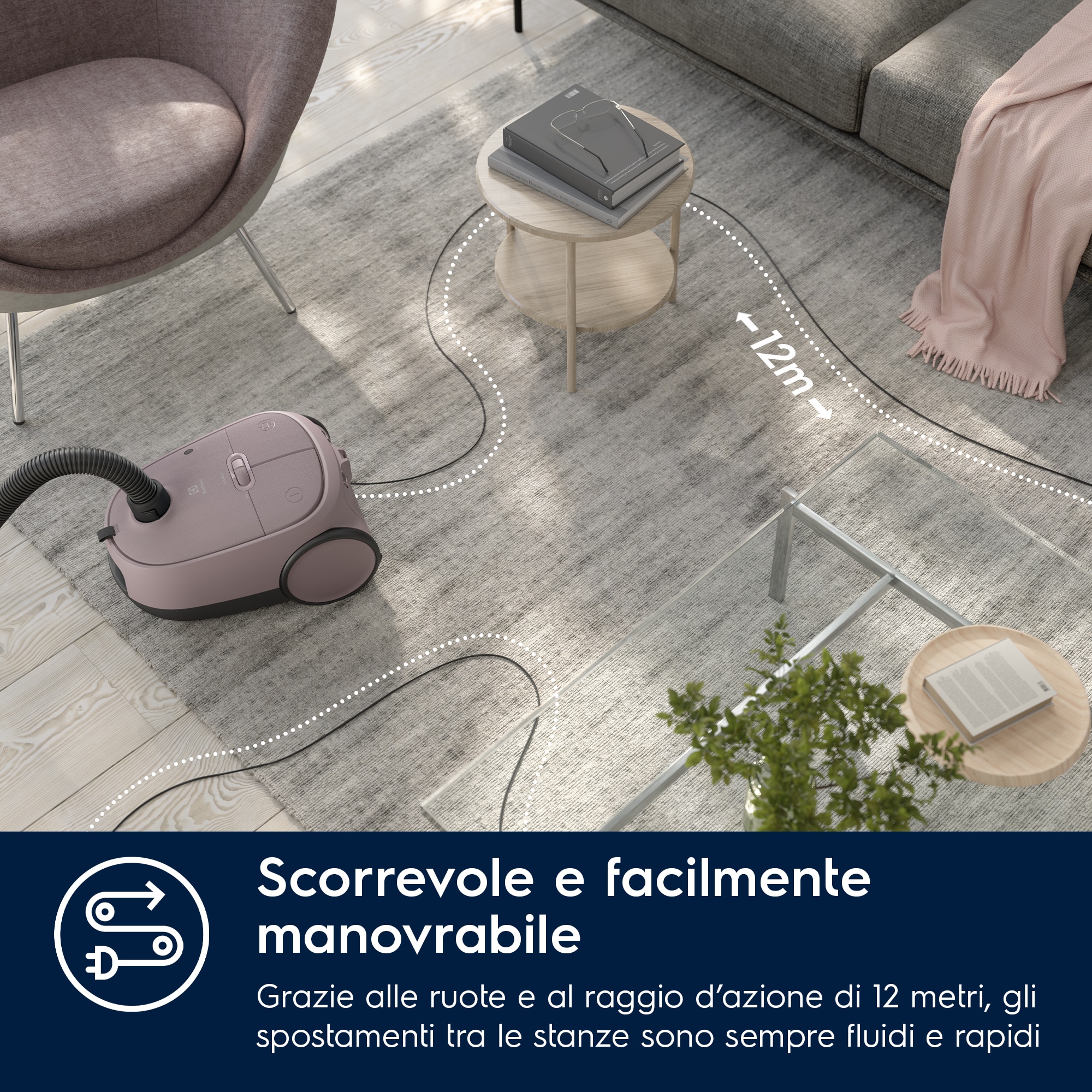 L’aspirapolvere con sacco Clean 600 combina la modalità pavimento automatica sulla bocchetta con un’accessibilità intuitiva per prestazioni senza compromessi e meno interruzioni.